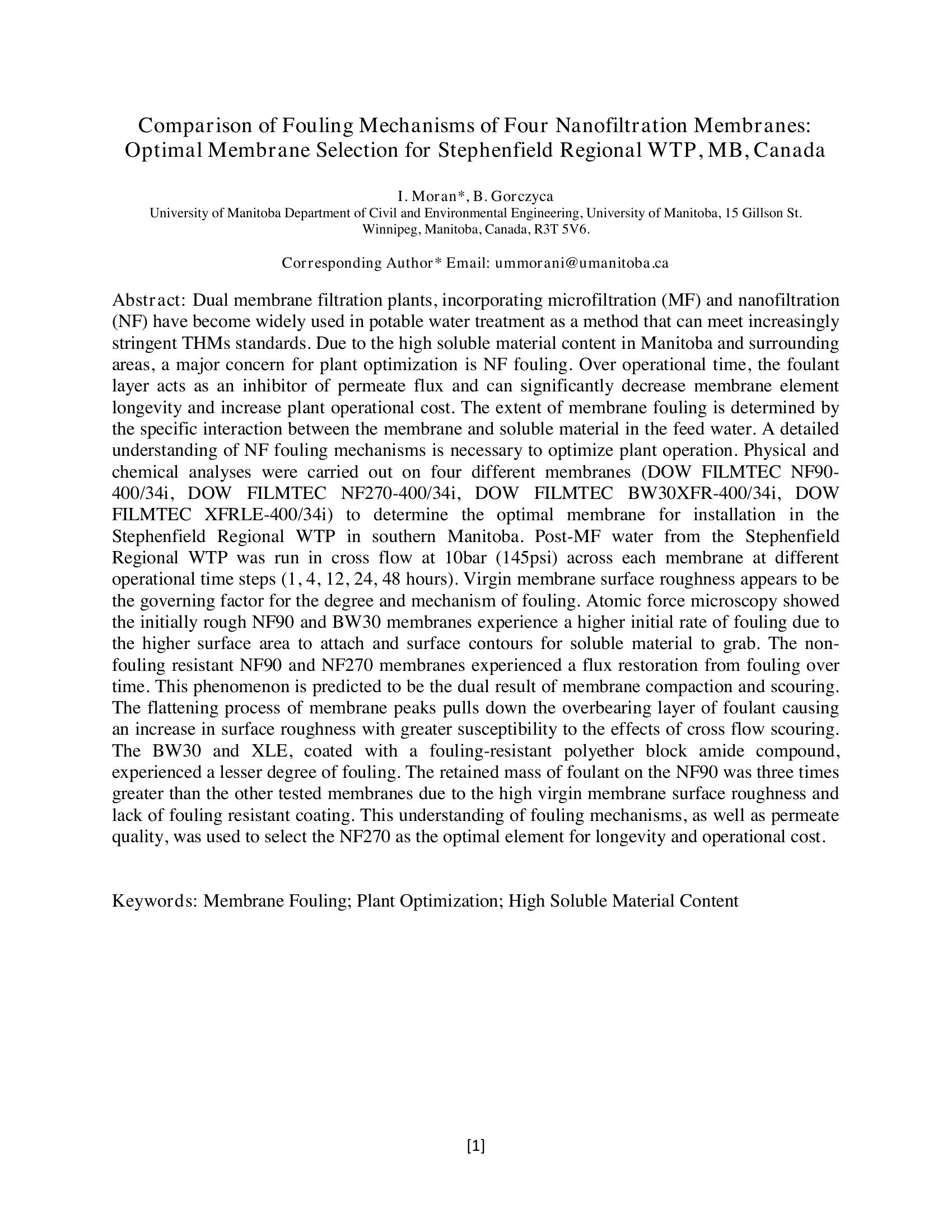 Comarison of Fouling Mechanisms of Four Nanofiltration Membranes: Optimal Membrane Selection for Stephenfield Regional WTP, MB, Canada