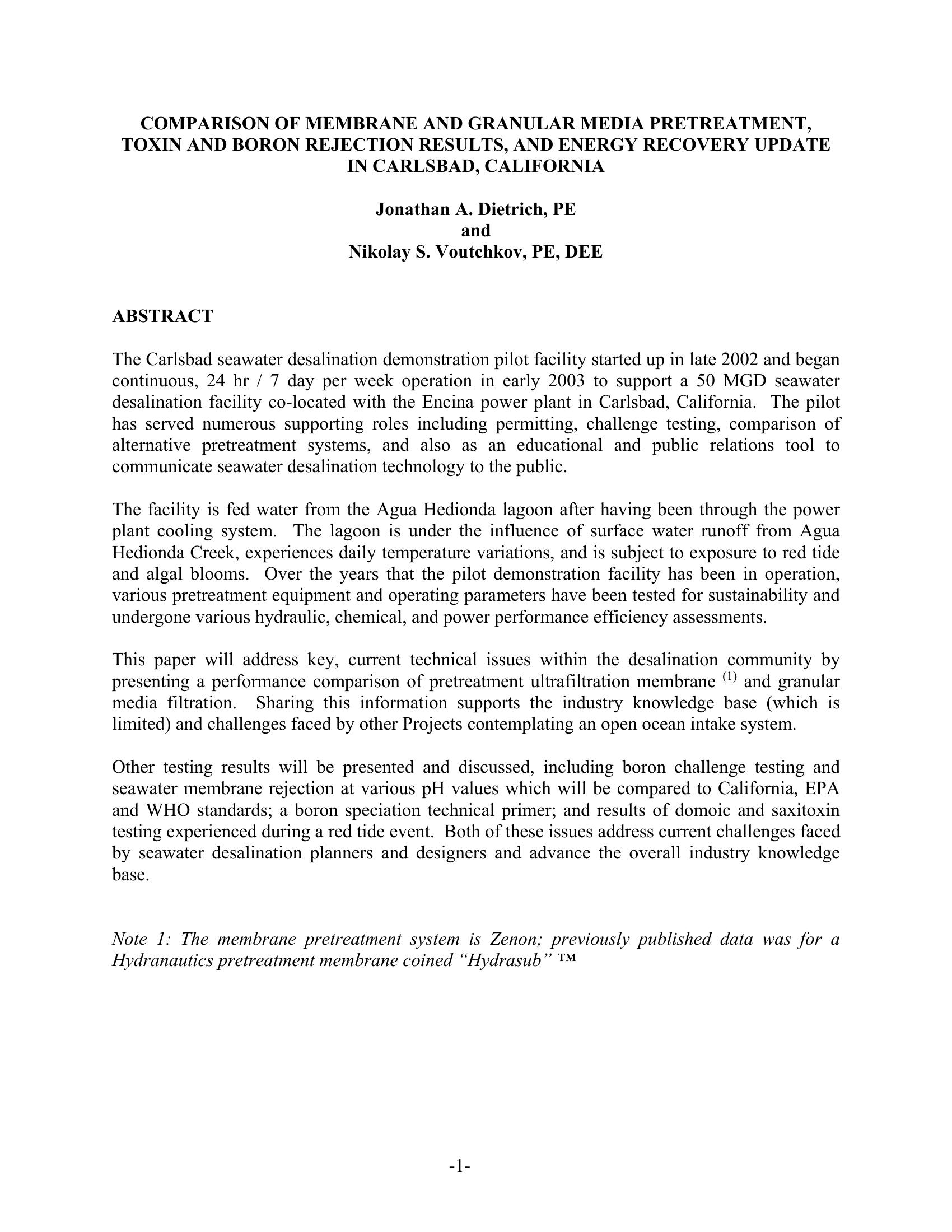 The Carlsbad, CA seawater desalination demonstration pilot facility started up in late 2002 and began continuous, 24 hr / 7 day per week operation in early 2003. The facility is fed water from the Agua Hedionda lagoon after having been through the power plant cooling system. The lagoon is under the influence of surface water runoff from Agua Hedionda Creek, experiences daily temperature variations, and is subject to exposure to red tide and algal blooms. This paper will address key, current technical issues within the desalination community by presenting a performance comparison of pretreatment ultrafiltration membrane (1) and granular media filtration. Other testing results will be presented and discussed, including boron challenge testing and seawater membrane rejection at various pH values which will be compared to California, EPA and WHO standards; a boron speciation technical primer; and results of domoic and saxitoxin testing experienced during a red tide event.