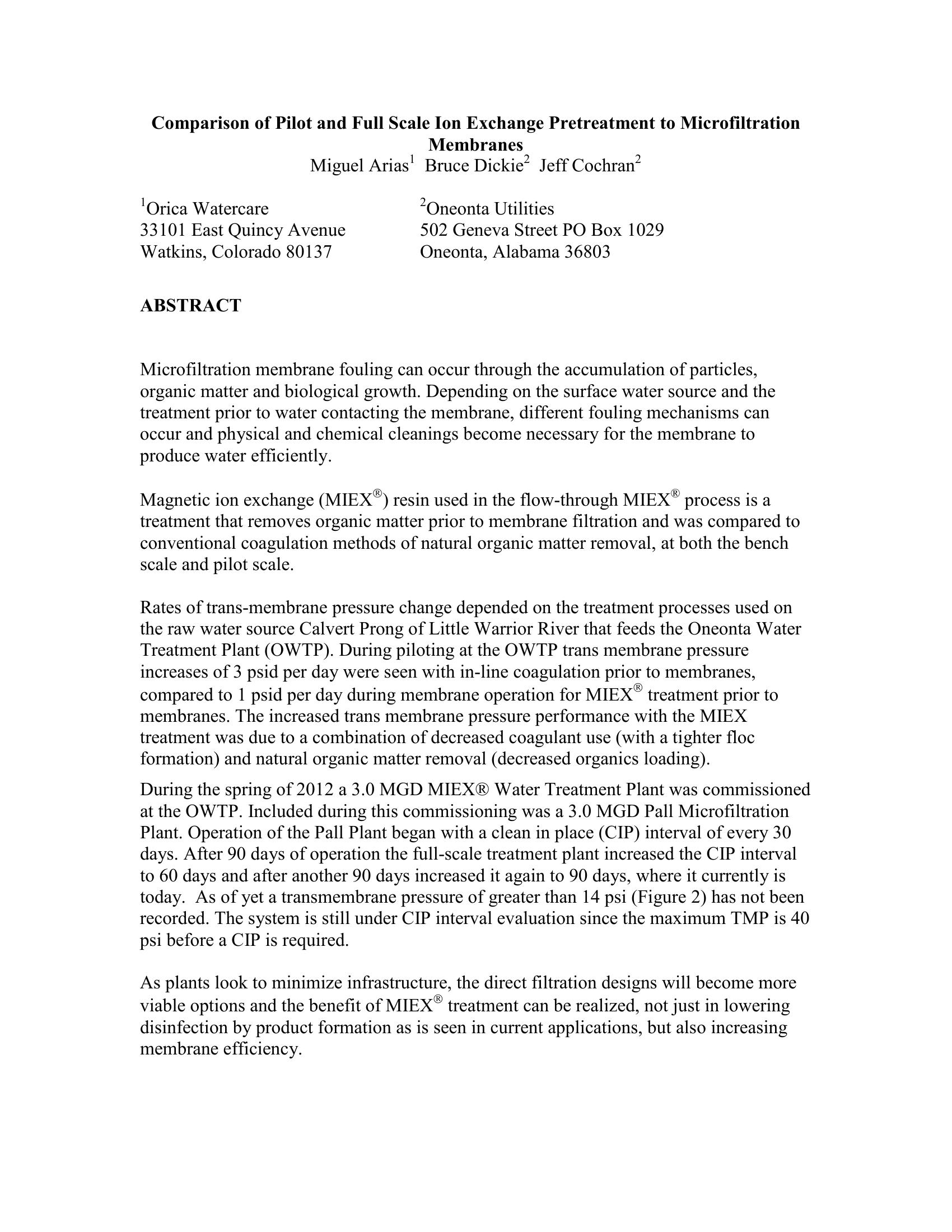 Comparison of Pilot and Full Scale Ion Exchange Pretreatment to Microfiltration Membranes
