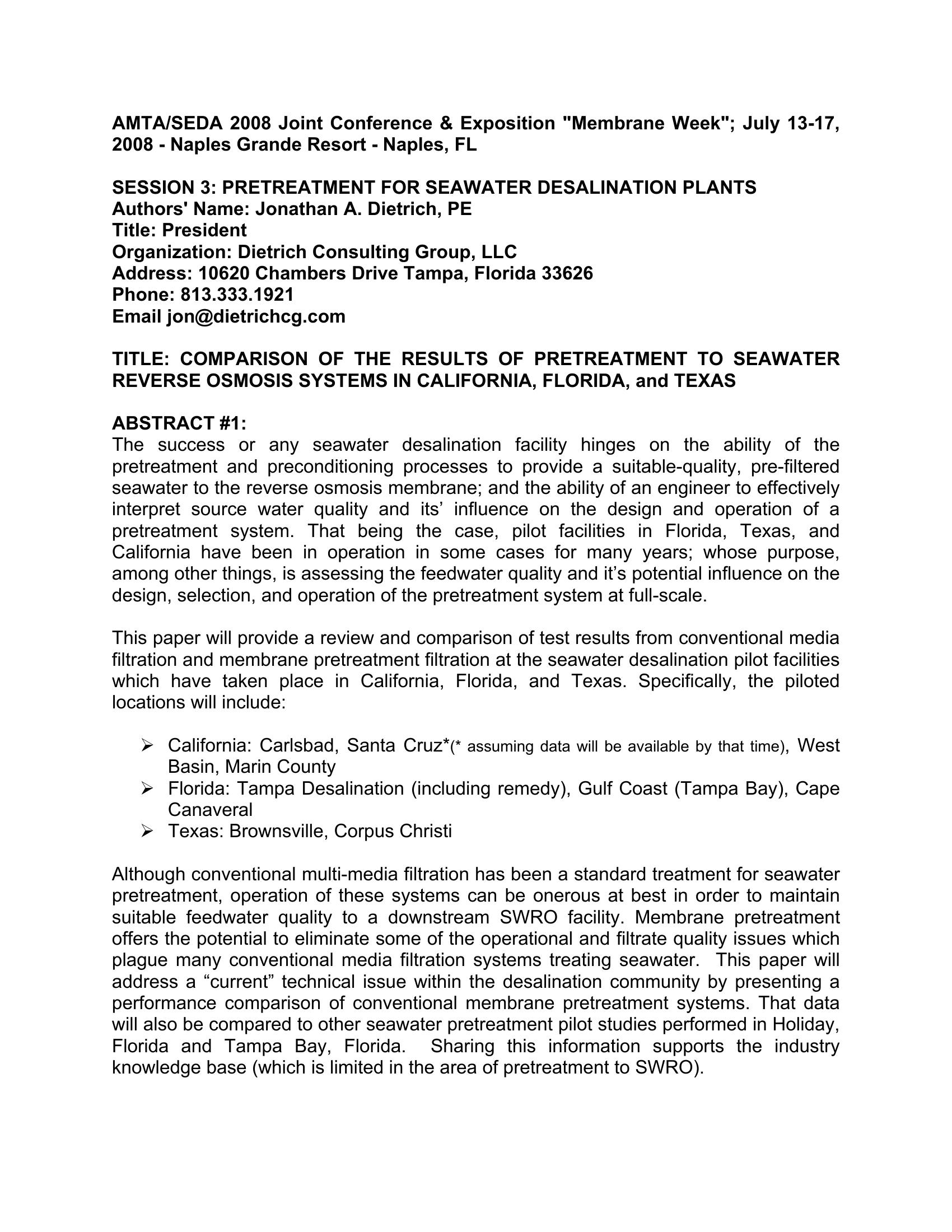 Comparison of the Results of Pretreatment to Seawater Reverse Osmosis Systems in California, Florida, and Texas