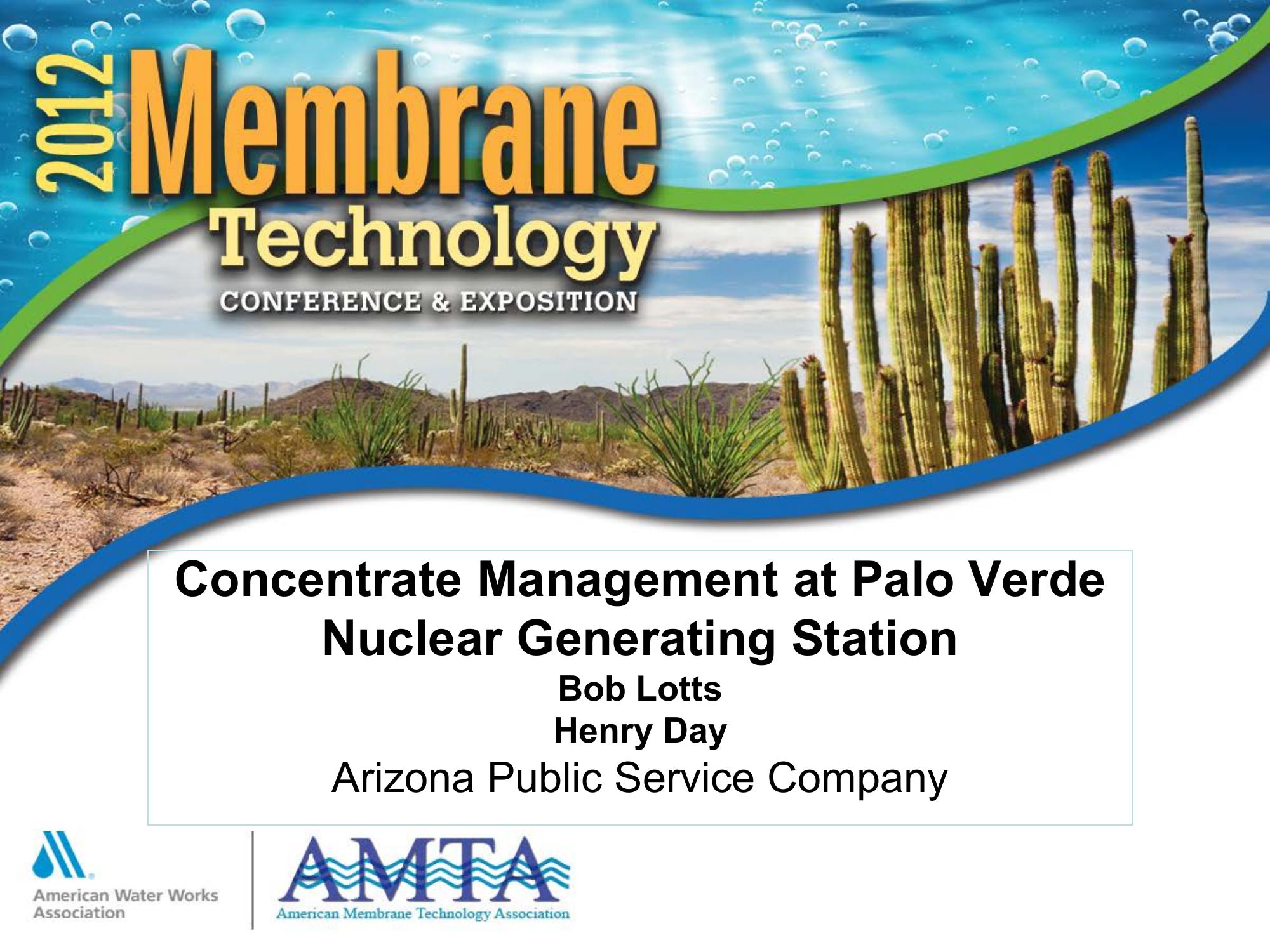 This presentation provides an overview of concentrate management at Palo Verde Nuclear Generating Station. It covers regulatory issues related to water and air and summarizes where water and air rules collide and the implications of these overlapping regulations related to treatment of cooling water. The study concludes that influent TDS trends must be monitored and increases in influent TDS may require advanced treatment. Other challenges related to this process are described.