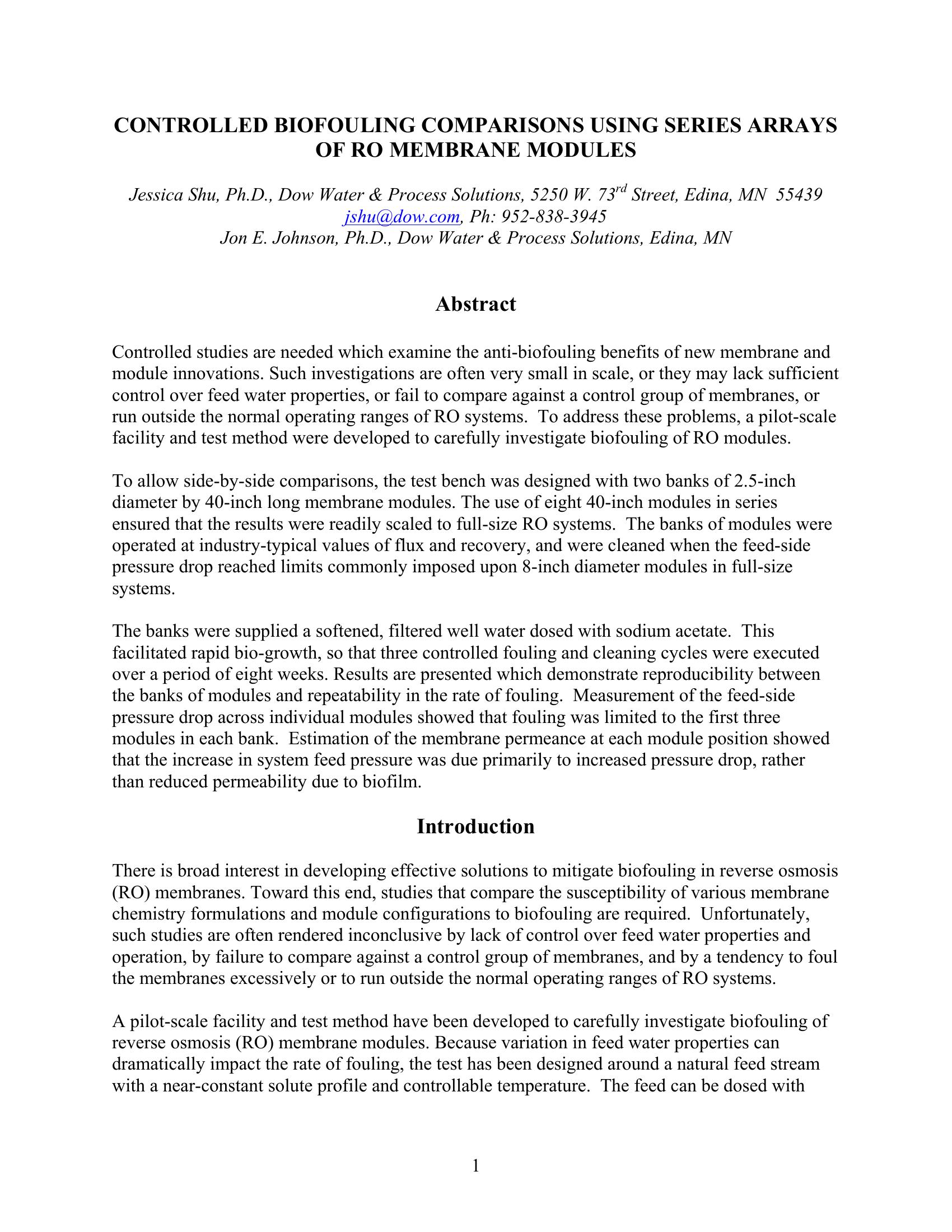 Controlled studies are needed which examine the anti-biofouling benefits of new membrane and module innovations. Such investigations are often very small in scale, or they may lack sufficient control over feed water properties, or fail to compare against a control group of membranes, or run outside the normal operating ranges of RO systems. To address these problems, a pilot-scale facility and test method were developed to carefully investigate biofouling of RO modules.
