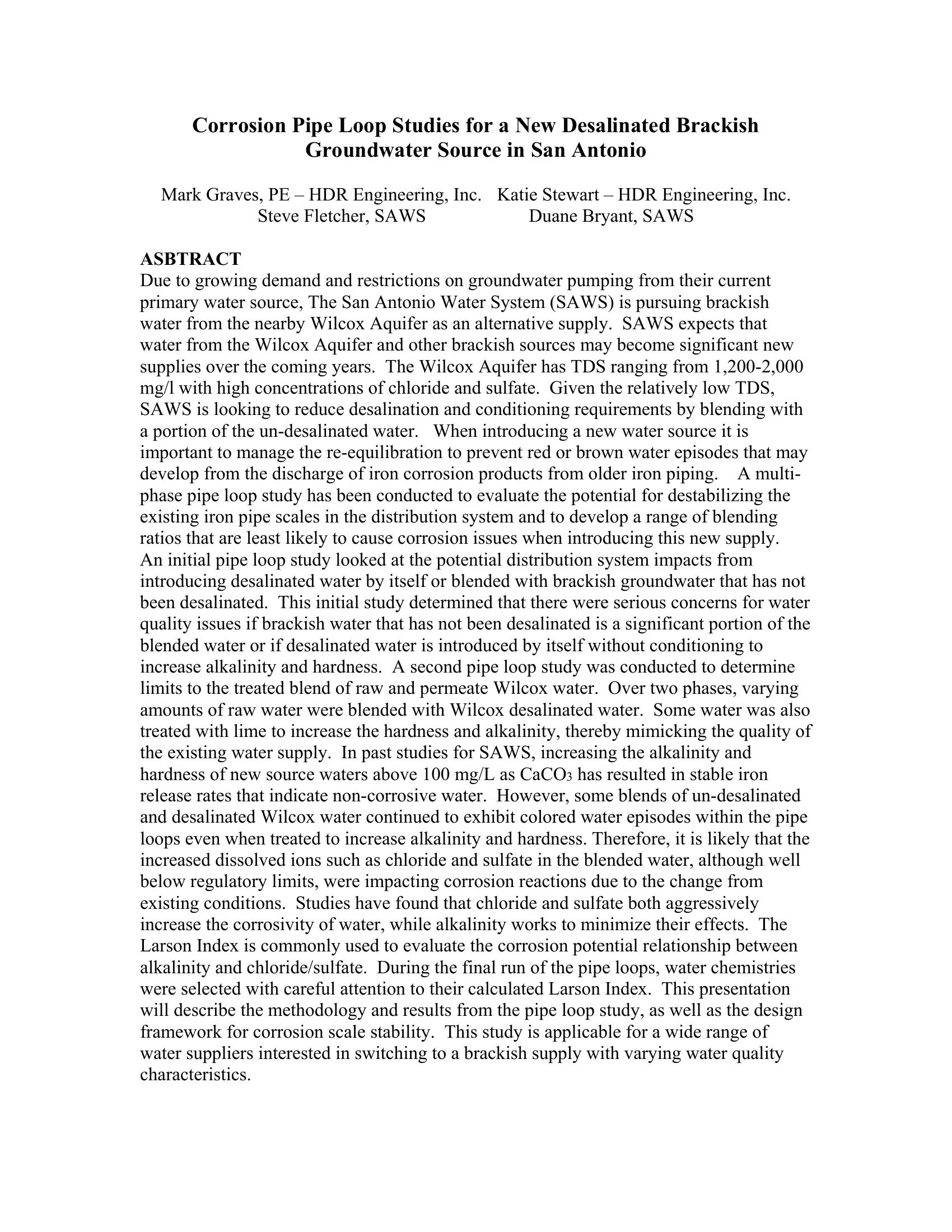 The San Antonio Water System (SAWS) is considering using raw and desalinated brackish groundwater from the Wilcox Aquifer to supplement their current supplies. Introduction of a new water source into SAWS’ distribution system has the potential to generate changes related to corrosion, metal release, and aesthetics (i.e., color). Pipes within the distribution system have developed corrosion scales that are in equilibrium with the current water quality. Adding a new water source could disturb the scales, causing a release of corrosion products into the distribution system. This investigation assessed the potential for iron release from corrosion scales inside aged galvanized iron pipe when exposed to various blends of desalinated brackish groundwater and raw brackish groundwater. All of the pipes used in this study were collected from residences in the Alamo Heights area in north-central San Antonio. The results from the three rounds of pipe loop sampling indicated untreated blends of water had significantly higher release rates than treated water at the same blends. Also, at raw water blends of 20% or greater, iron release rates were high, and the Larson Index was a good indicator of the potential for corrosion release. At the water quality tested for this pipe loop study, a treated blend of water that contains no more than 10% raw water is recommended in order to minimize the corrosion release rates within the SAWS distribution system.
