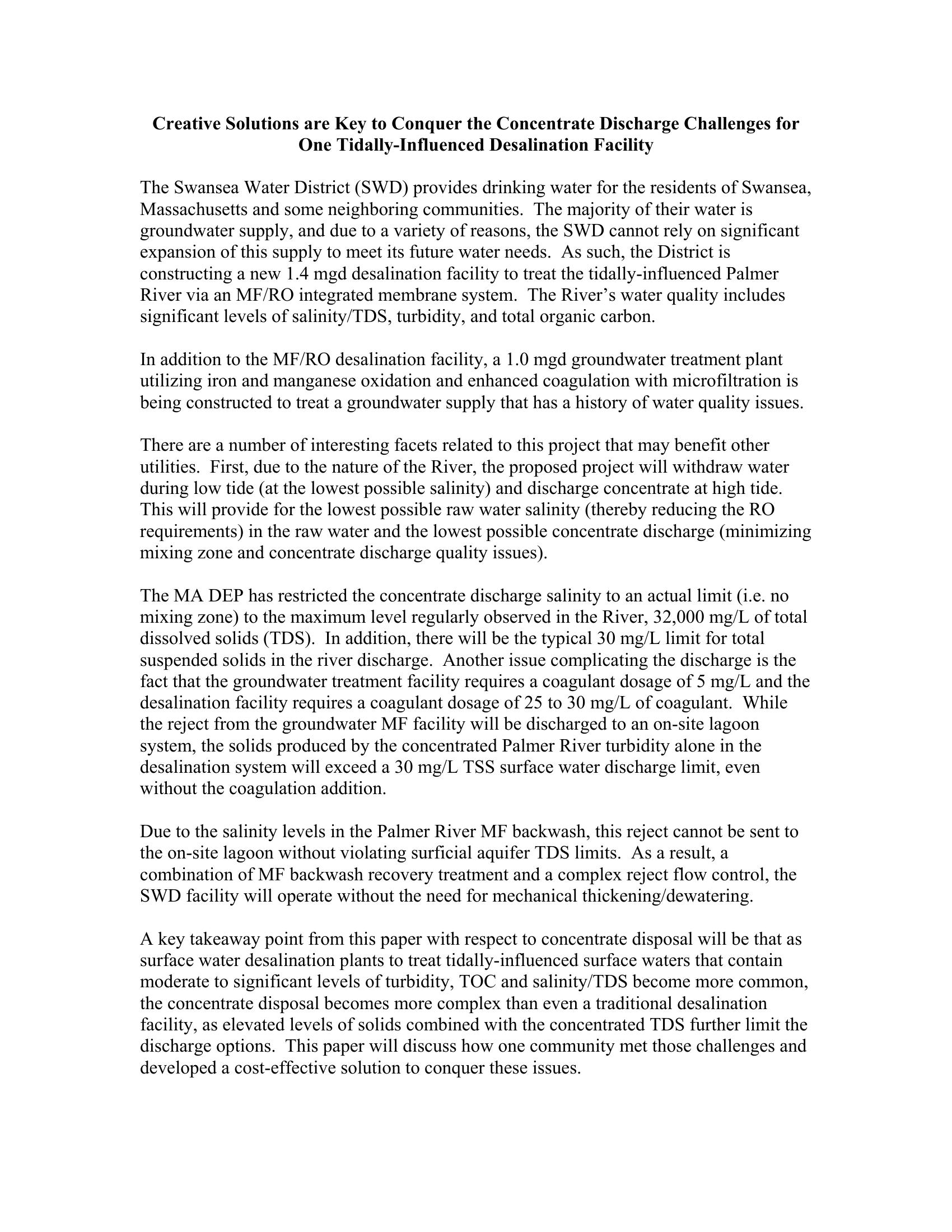 The Swansea Water District (SWD) provides drinking water for the residents of Swansea, Massachusetts and some neighbor communities. As such, the District is constructing a new 1.4 mgd desalination facility to treat the tidally-influenced Palmer River via an MF/RO integrated membrane system. In addition to the MF/RO desalination facility, a 1.0 mgd groundwater treatment plant utilizing iron and manganese oxidation and enhanced coagulation with microfiltration is being constructed to treat a groundwater supply that has a history of water quality issues. This paper will discuss a cost-effective solution to concentrate disposal at the SWA desalination plant treating tidally-influenced surface waters.