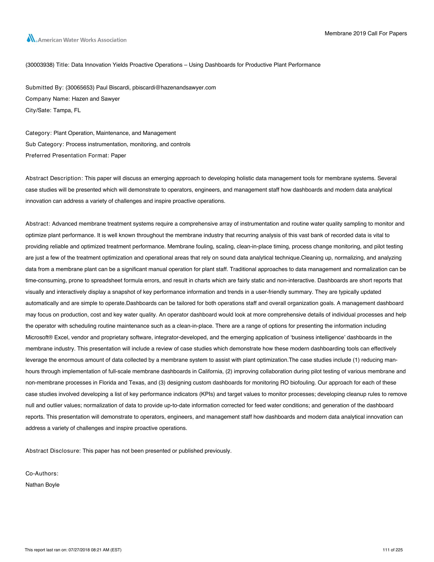 This paper will discuss an emerging approach to developing holistic data management tools for membrane systems. Several case studies will be presented which will demonstrate to operators, engineers, and management staff how dashboards and modern data analytical innovation can address a variety of challenges and inspire proactive operations.