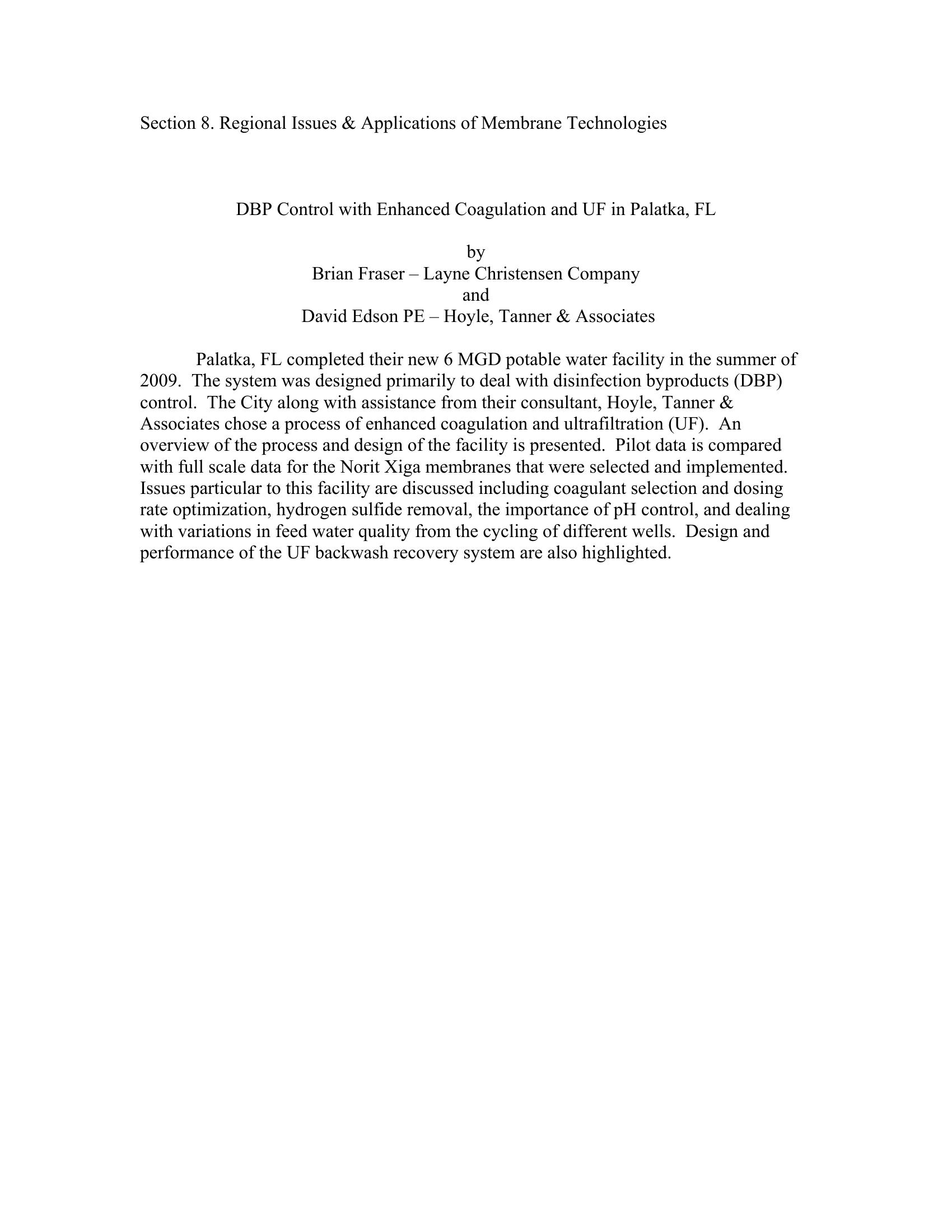DBP Control with Enhanced Coagulation and UF in Palatka, FL