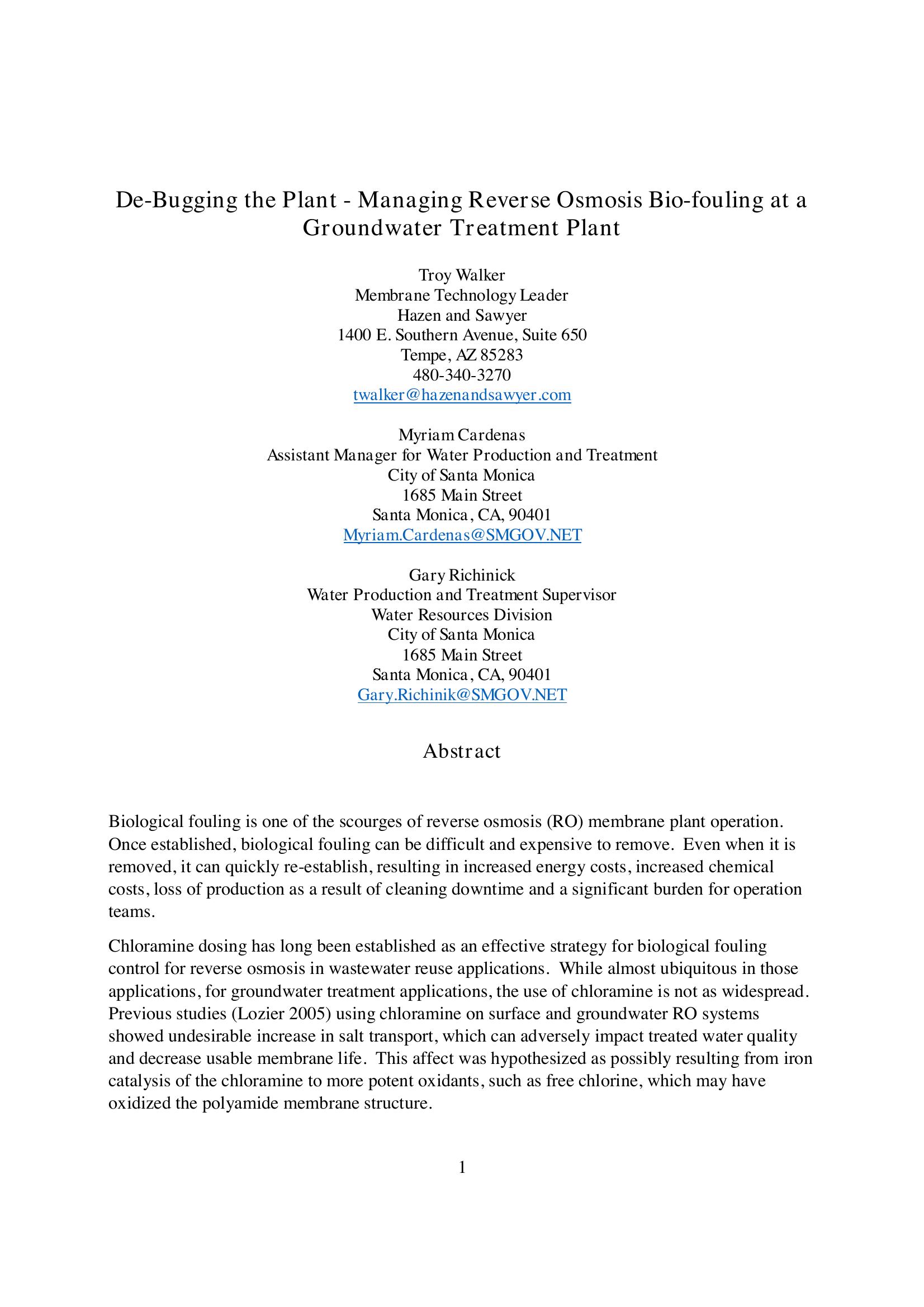 | Keywords | Biofouling, Reverse Osmosis, Chloramine, City of Santa Monica |