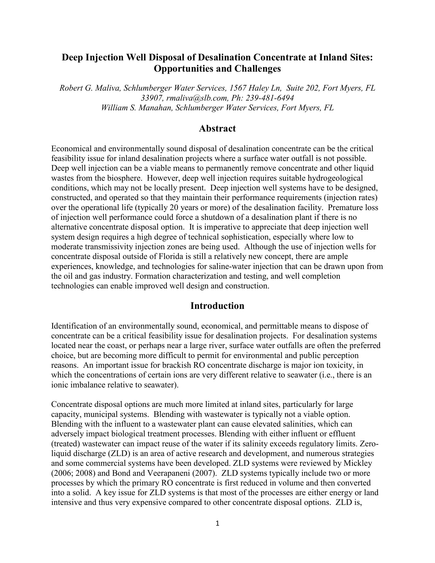 Economical and environmentally sound disposal of desalination concentrate can be the critical feasibility issue for inland desalination projects where a surface water outfall is not possible. Deep well injection can be a viable means to permanently remove concentrate and other liquid wastes from the biosphere. However, deep well injection requires suitable hydrogeological conditions, which may not be locally present. It is imperative to appreciate that deep injection well system design requires a high degree of technical sophistication, especially where low to