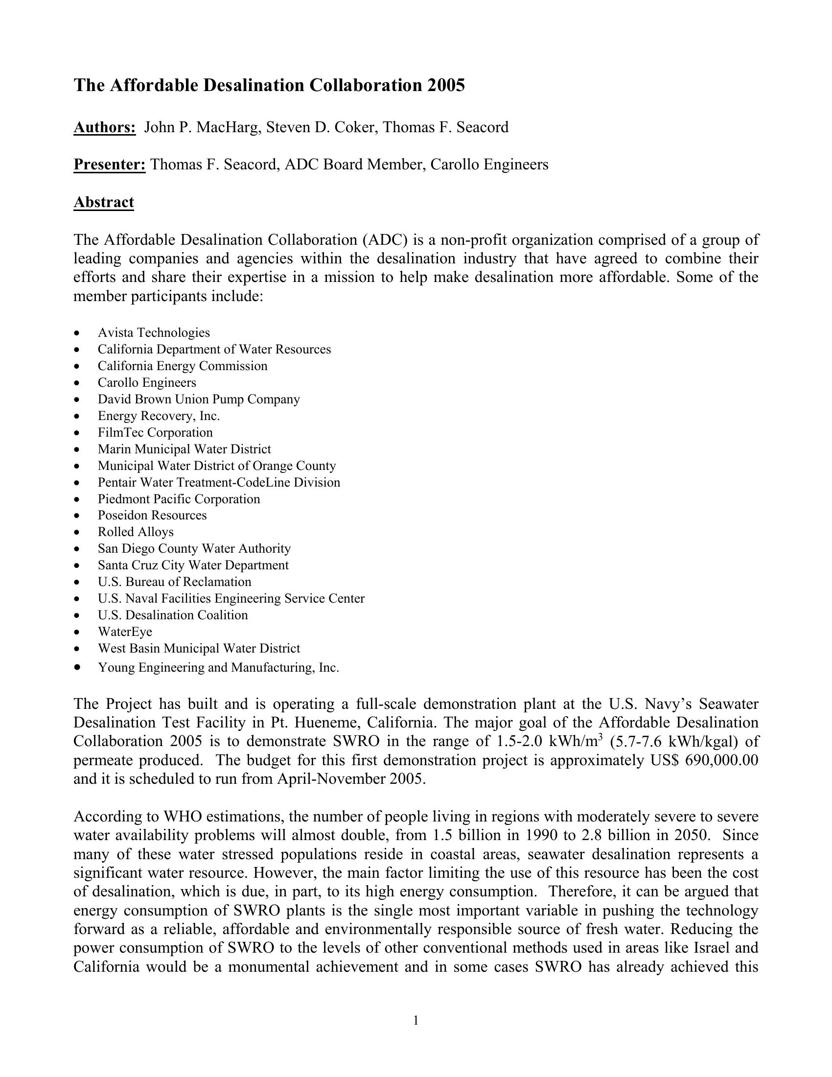 Overview of the preliminary work of the Affordable Desal Coalition to prove the reliability and affordability of seawater reverse osmosis.