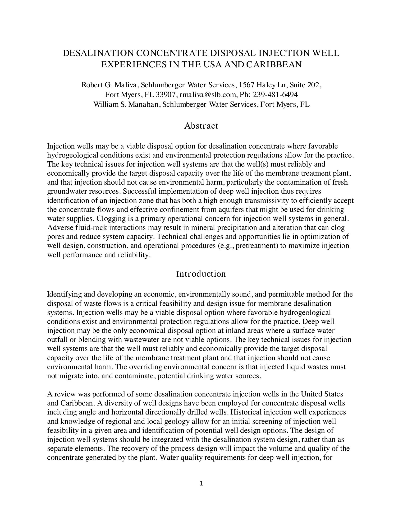 Desalination Concentrate Disposal Injection Well Experiences in the USA and Caribbean