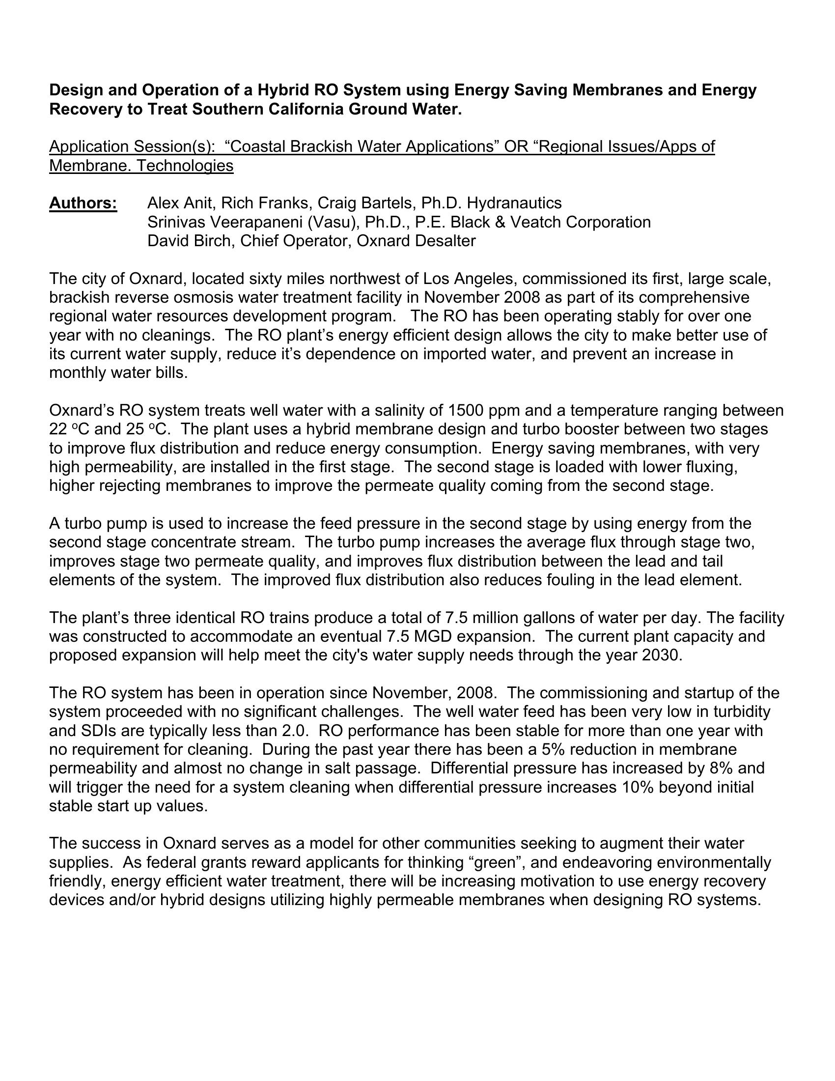 Design and Operation of a Hybrid RO System using Energy Saving Membranes and Energy Recovery to Treat Southern California Ground Water