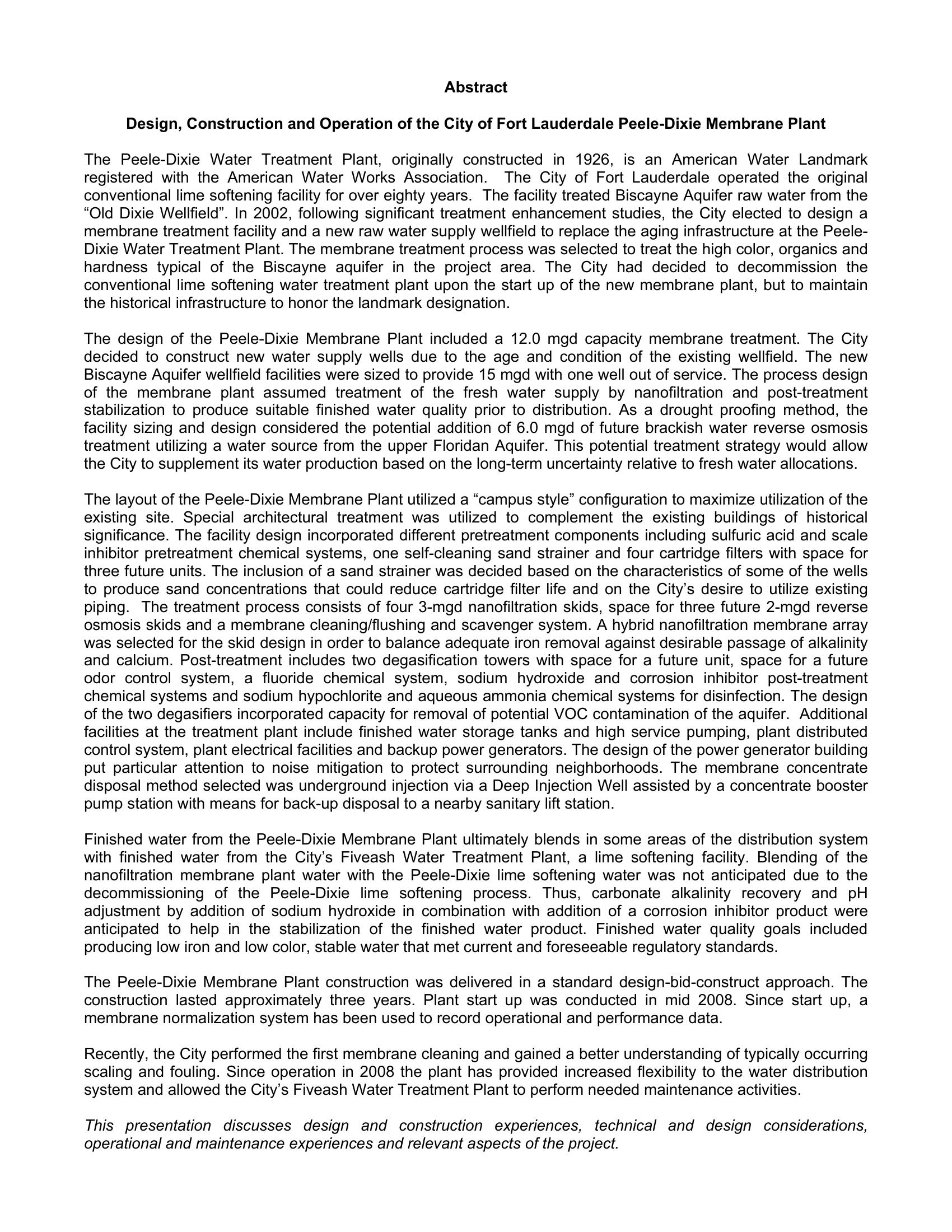 Design, Construction and Operation of the City of Fort Lauderdale Peele-Dixie Membrane Plant