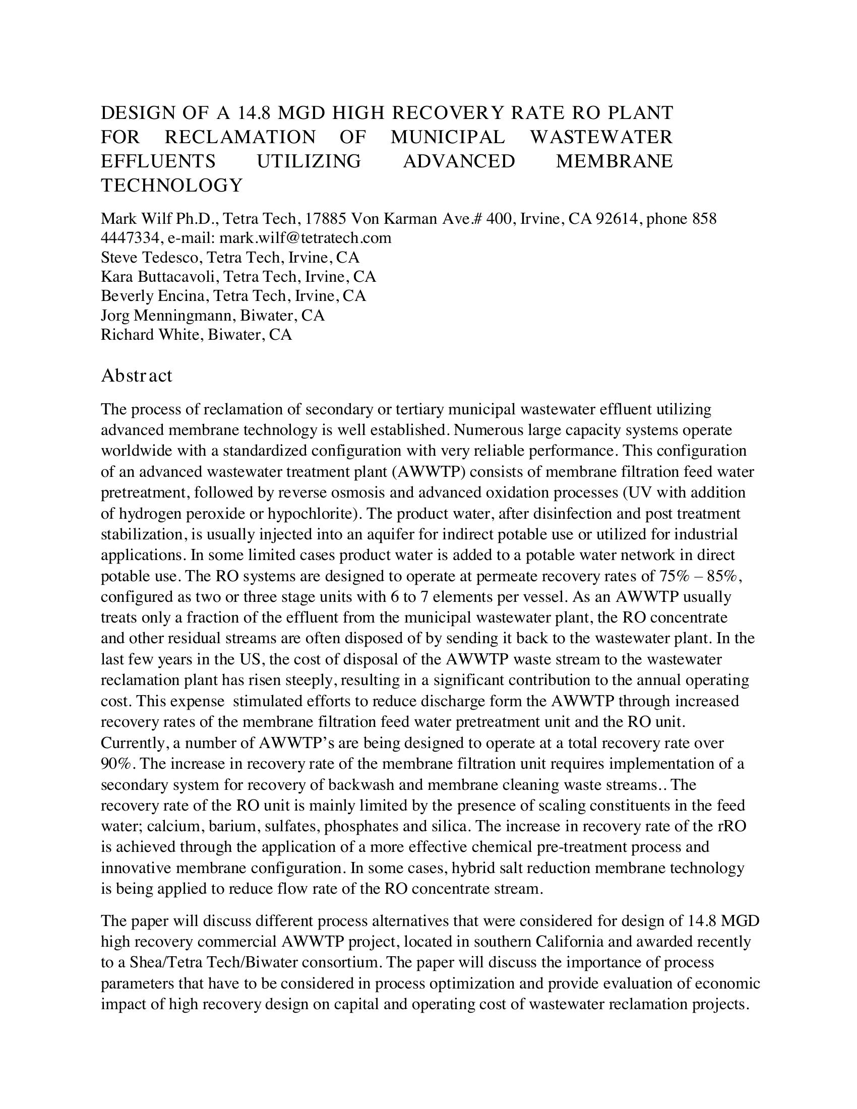 Currently, a number of AWWTP’s are being designed to operate at a total recovery rate over 90%. The increase in recovery rate of the membrane filtration unit requires implementation of a secondary system for recovery of backwash and membrane cleaning waste streams.. The recovery rate of the RO unit is mainly limited by the presence of scaling constituents in the feed water; calcium, barium, sulfates, phosphates and silica. The increase in recovery rate of the rRO is achieved through the application of a more effective chemical pre-treatment process and innovative membrane configuration. In some cases, hybrid salt reduction membrane technology is being applied to reduce flow rate of the RO concentrate stream. The paper will discuss different process alternatives that were considered for design of 14.8 MGD high recovery commercial AWWTP project, located in southern California and awarded recently to a Shea/Tetra Tech/Biwater consortium. The paper will discuss the importance of process parameters that have to be considered in process optimization and provide evaluation of economic impact of high recovery design on capital and operating cost of wastewater reclamation projects.