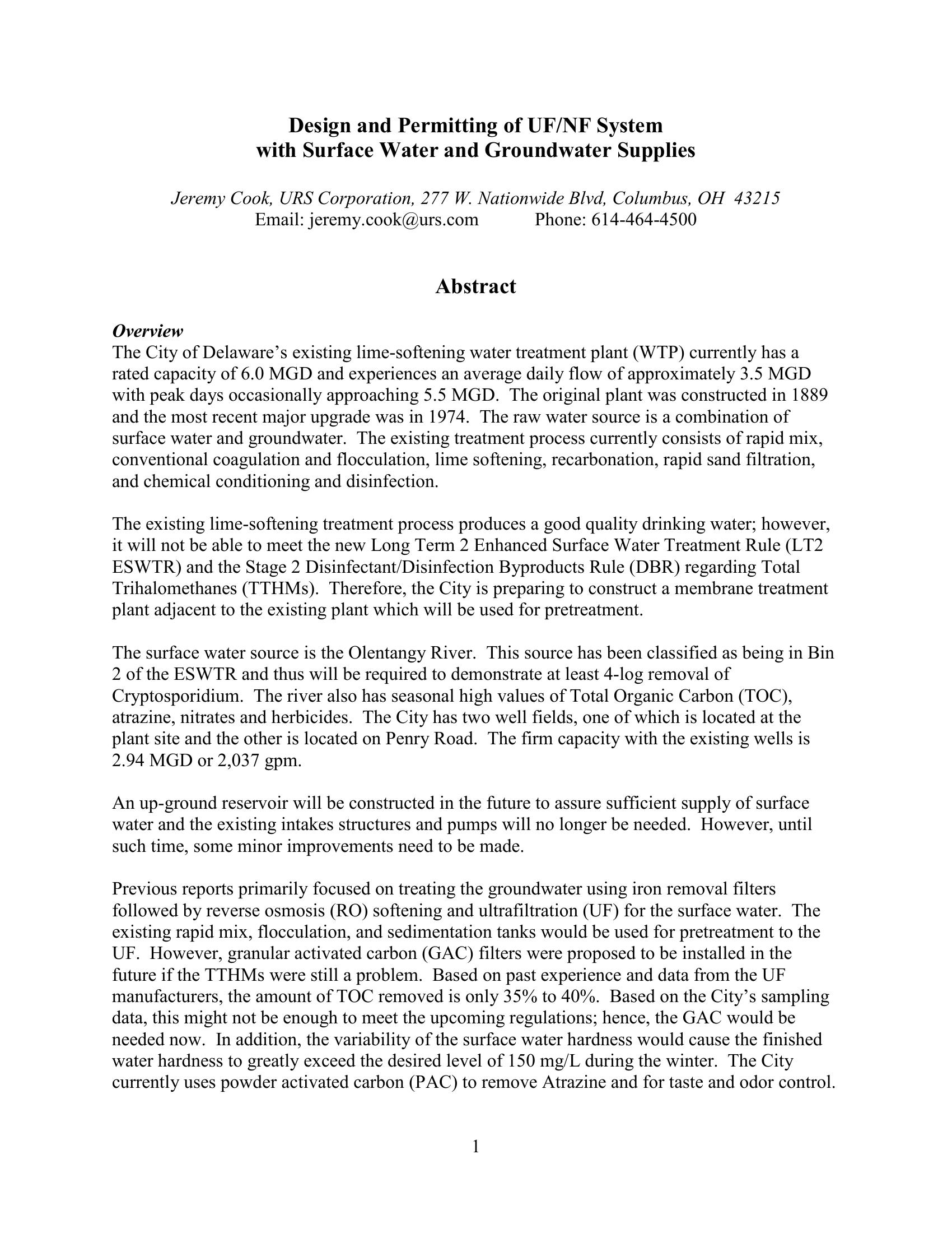 Expansion of the City of Delaware’s existing lime-softening water treatment plant with UF/RO in order to address THM formation and other removal considerations are discussed in this paper. The surface water RO will remove TOC, atrazine, nitrates and herbicides which eliminates the need for GAC from the existing plant. A case study comparing the lime softening and UF/RO process is presented.