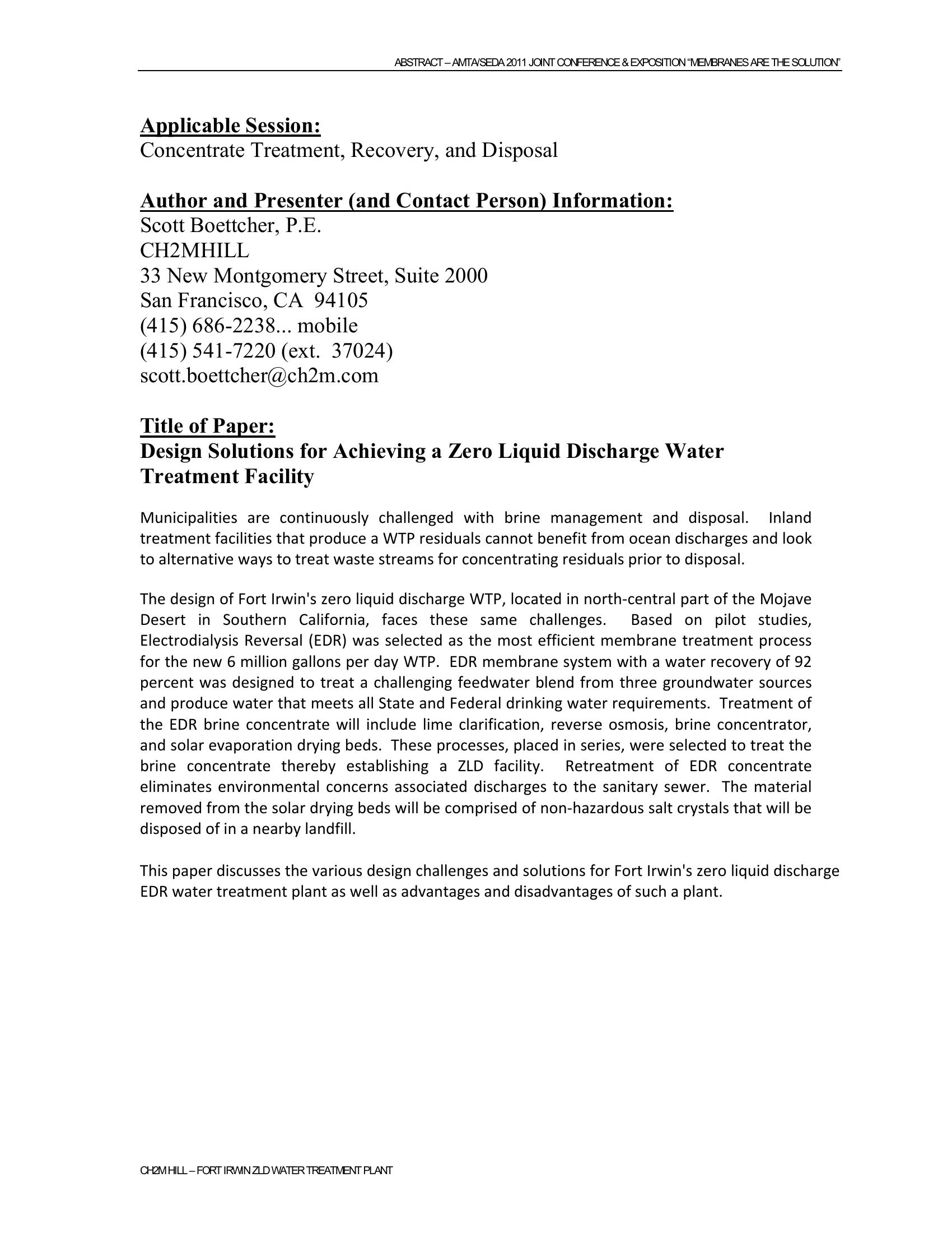 This paper discusses the various design challenges and solutions for Fort Irwin’s zero liquid discharge EDR water treatment plant as well as advantages and disadvantages of such a plant.