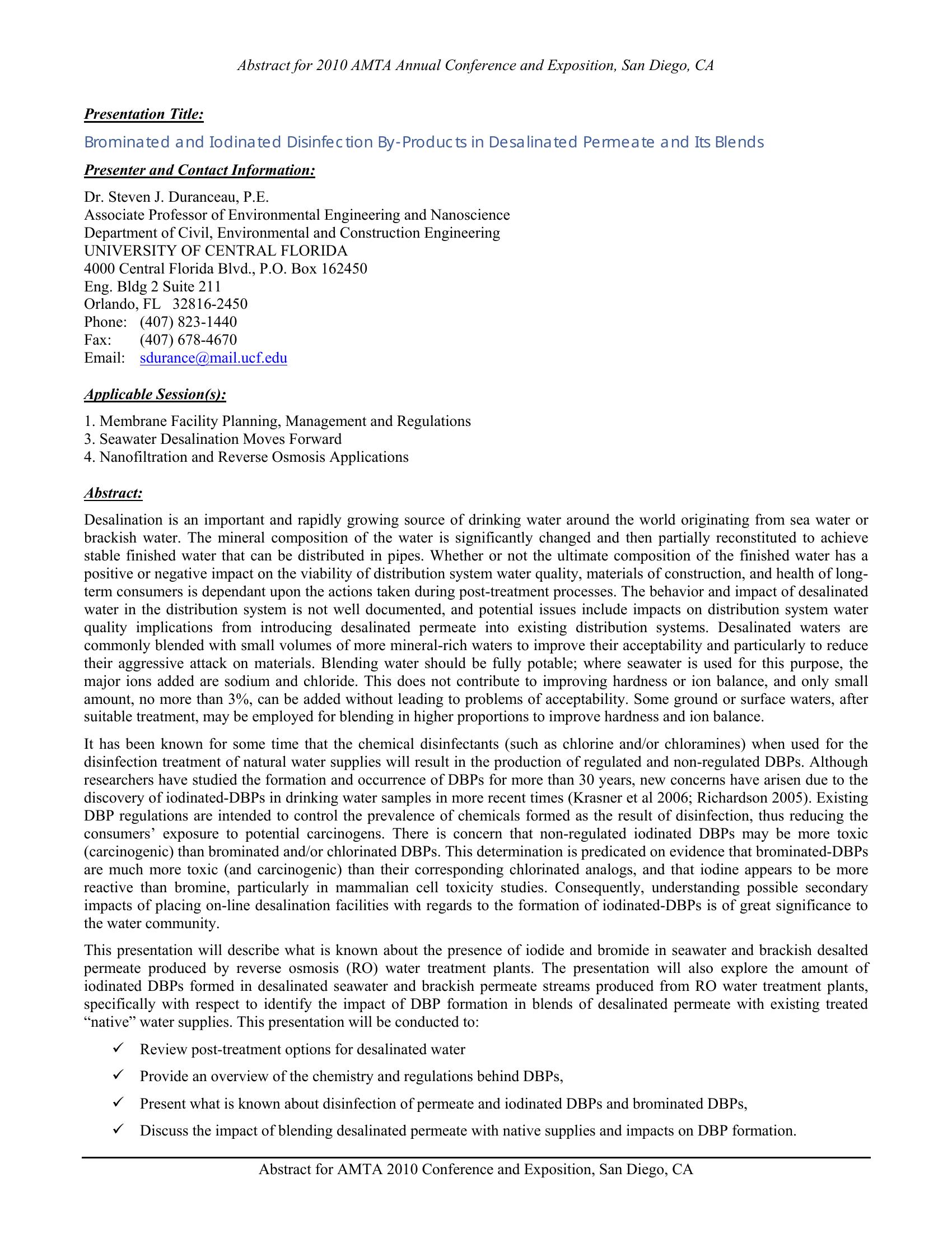 This presentation will describe what is known about the presence of iodide and bromide in seawater and brackish desalted permeate produced by reverse osmosis (RO) water treatment plants. The presentation will also explore the amount of iodinated DBPs formed in desalinated seawater and brackish permeate streams produced from RO water treatment plant