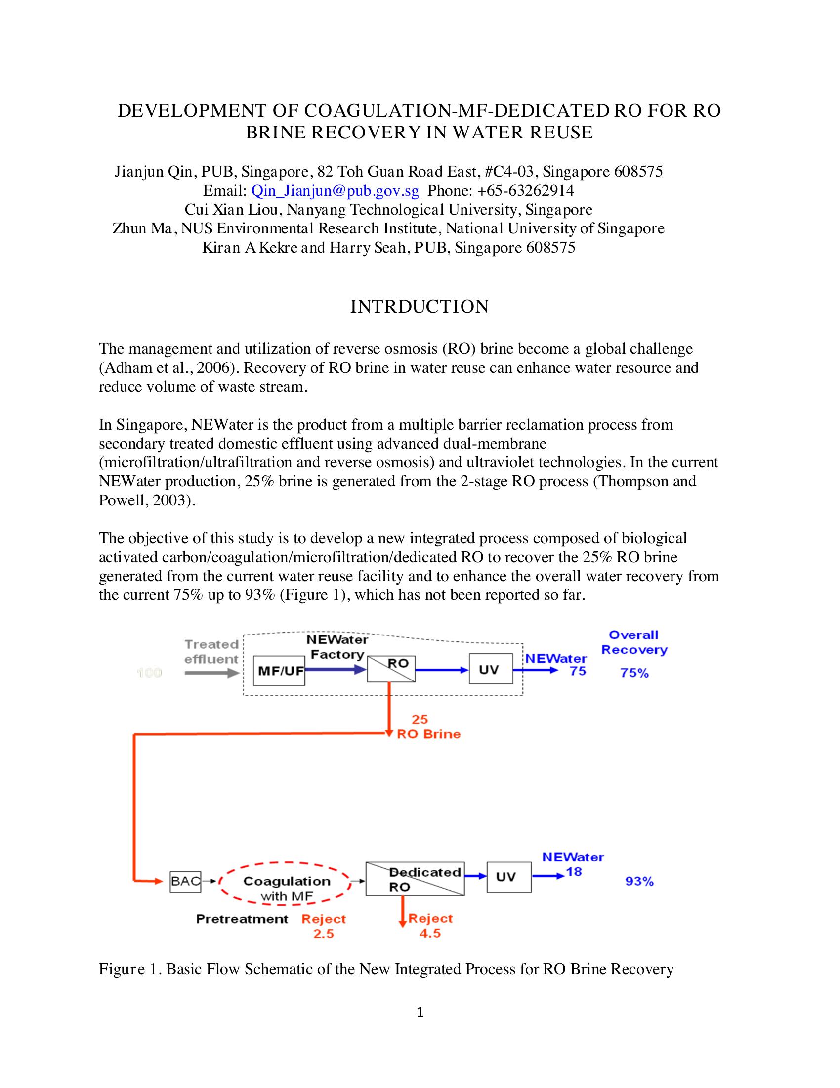 Development of Coagulation-MF-Dedicated RO for RO Brine Recovery in Water Reuse