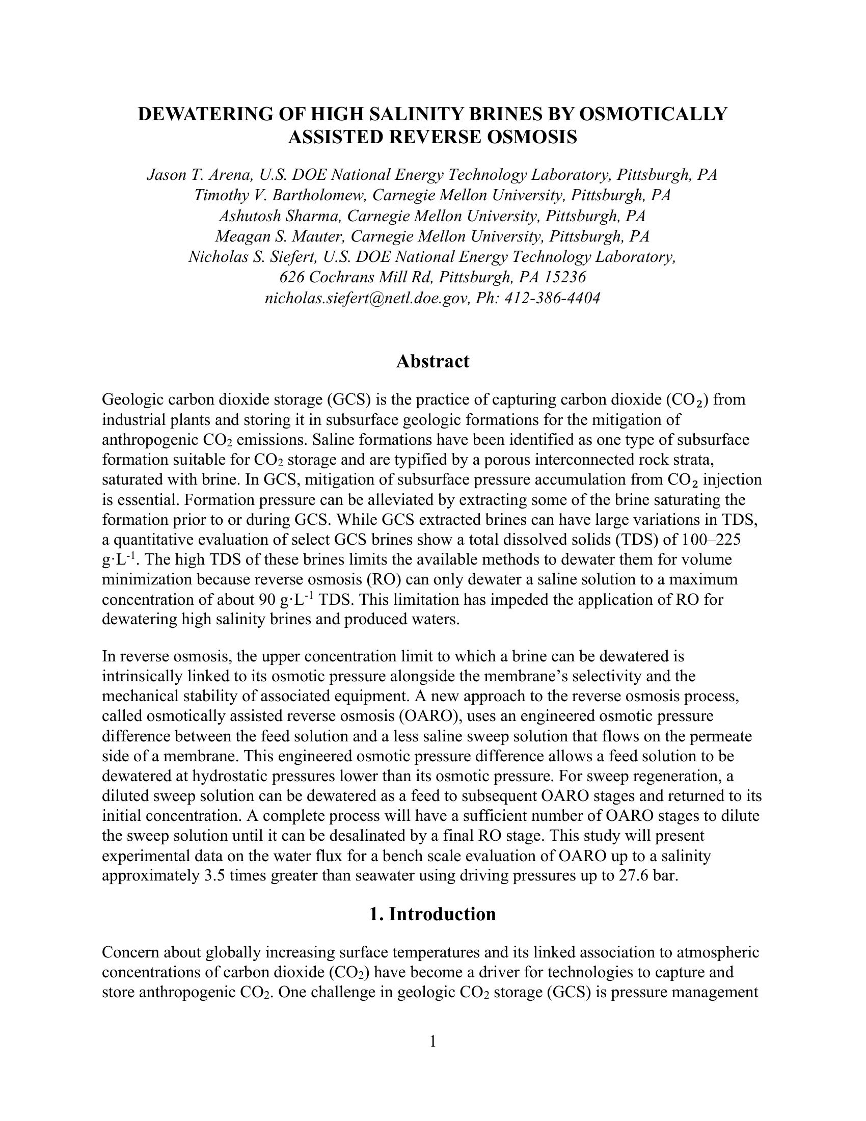 In reverse osmosis (RO), the upper concentration limit to which a brine can be dewatered is about 90 g/L total dissolved solids (TDS). This limitation contravenes the use of RO for the management of brines extracted for subsurface pressure management inthe geologic carbon dioxide storage (GCS). Some extracted GCS brines have a total dissolved solids (TDS) of 100 225 g/L making them too saline to be dewatered by reverse osmosis. A proposed approach to dewater high salinity brines by reverse osmosis, called osmotically assisted reverse osmosis (OARO), uses an engineered osmotic pressure difference to lower the feed pressures needed for reverse osmosis to occur. This study will experimentally show positive water flux for a bench scale evaluation of OARO for feed solutions having a salinity up to approximately 3.5 times greater than seawater using a driving pressure of only 27.6 bar.