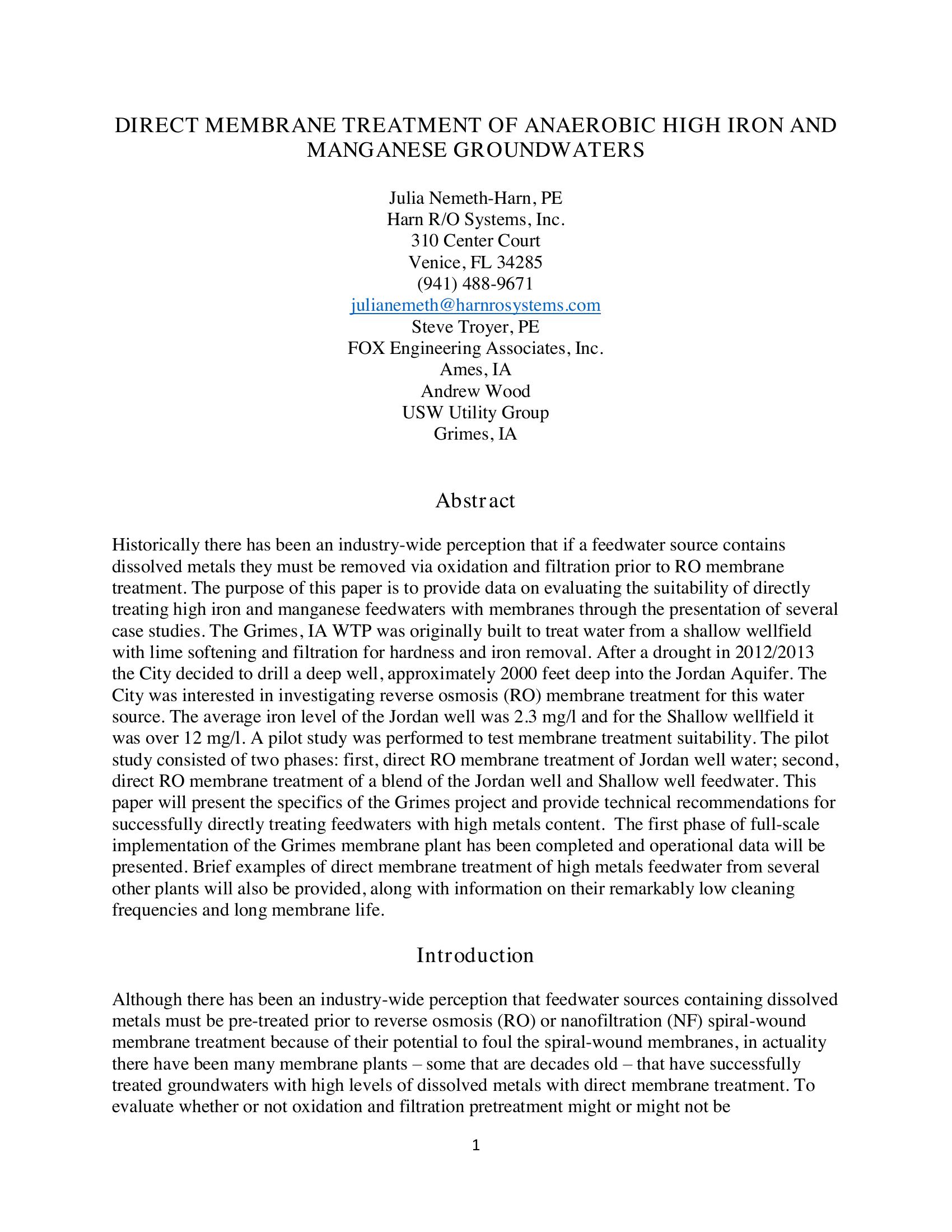 Historically there has been an industry-wide perception that if a feedwater source contains dissolved metals they must be removed via oxidation and filtration prior to RO membrane treatment. The purpose of this paper is to provide data on evaluating the suitability of directly treating high iron and manganese feedwaters with membranes through the presentation of several case studies. The Grimes, IA WTP was originally built to treat water from a shallow wellfield with lime softening and filtration for hardness and iron removal. After a drought in 2012/2013 the City decided to drill a deep well, approximately 2000 feet deep into the Jordan Aquifer. The City was interested in investigating reverse osmosis (RO) membrane treatment for this water source. The average iron level of the Jordan well was 2.3 mg/l and for the Shallow wellfield it was over 12 mg/l. A pilot study was performed to test membrane treatment suitability. The pilot study consisted of two phases: first, direct RO membrane treatment of Jordan well water; second, direct RO membrane treatment of a blend of the Jordan well and Shallow well feedwater. This paper will present the specifics of the Grimes project and provide technical recommendations for successfully directly treating feedwaters with high metals content. The first phase of full-scale implementation of the Grimes membrane plant has been completed and operational data will be presented. Brief examples of direct membrane treatment of high metals feedwater from several other plants will also be provided, along with information on their remarkably low cleaning frequencies and long membrane life.