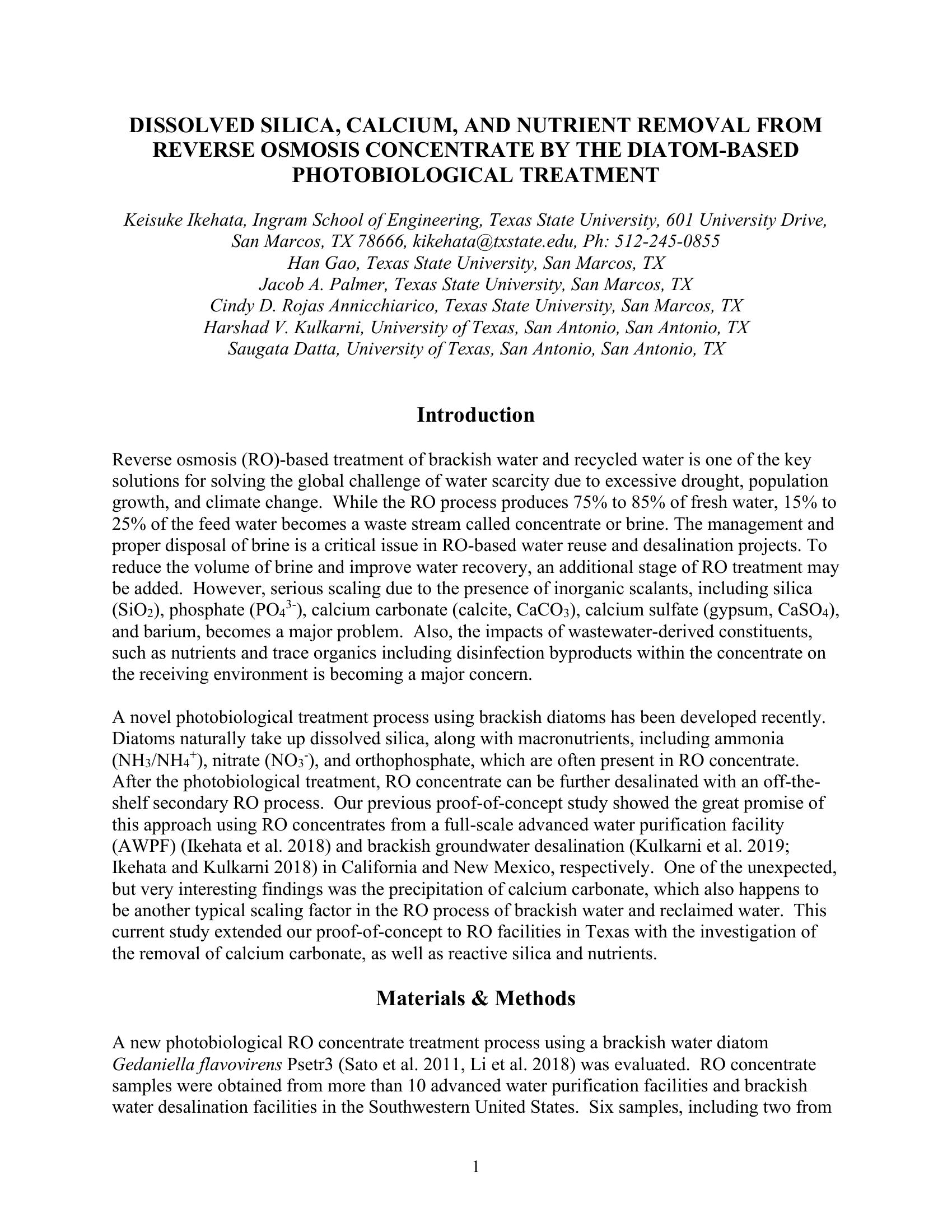 Reverse osmosis (RO)-based treatment of brackish water and recycled water is one of the key solutions for solving the global challenge of water scarcity due to excessive drought, population growth, and climate change. While the RO process produces 75% to 85% of fresh water, 15% to 25% of the feed water becomes a waste stream called concentrate or brine. The management and proper disposal of brine is a critical issue in RO-based water reuse and desalination projects. To reduce the volume of brine and improve water recovery, an additional stage of RO treatment may be added. However, serious scaling due to the presence of inorganic scalants, including silica (SiO2), phosphate (PO43-), calcium carbonate (calcite, CaCO3), calcium sulfate (gypsum, CaSO4), and barium, becomes a major problem. Also, the impacts of wastewater-derived constituents, such as nutrients and trace organics including disinfection byproducts within the concentrate on the receiving environment is becoming a major concern. A novel photobiological treatment process using brackish diatoms has been developed recently. Diatoms naturally take up dissolved silica, along with macronutrients, including ammonia (NH3/NH4+), nitrate (NO3-), and orthophosphate, which are often present in RO concentrate. After the photobiological treatment, RO concentrate can be further desalinated with an off-the-shelf secondary RO process. Our previous proof-of-concept study showed the great promise of this approach using RO concentrates from a full-scale advanced water purification facility (AWPF) (Ikehata et al. 2018) and brackish groundwater desalination (Kulkarni et al. 2019; Ikehata and Kulkarni 2018) in California and New Mexico, respectively. One of the unexpected, but very interesting findings was the precipitation of calcium carbonate, which also happens to be another typical scaling factor in the RO process of brackish water and reclaimed water. This current study extended our proof-of-concept to RO facilities in Texas with the investigation of the removal of calcium carbonate, as well as reactive silica and nutrients.