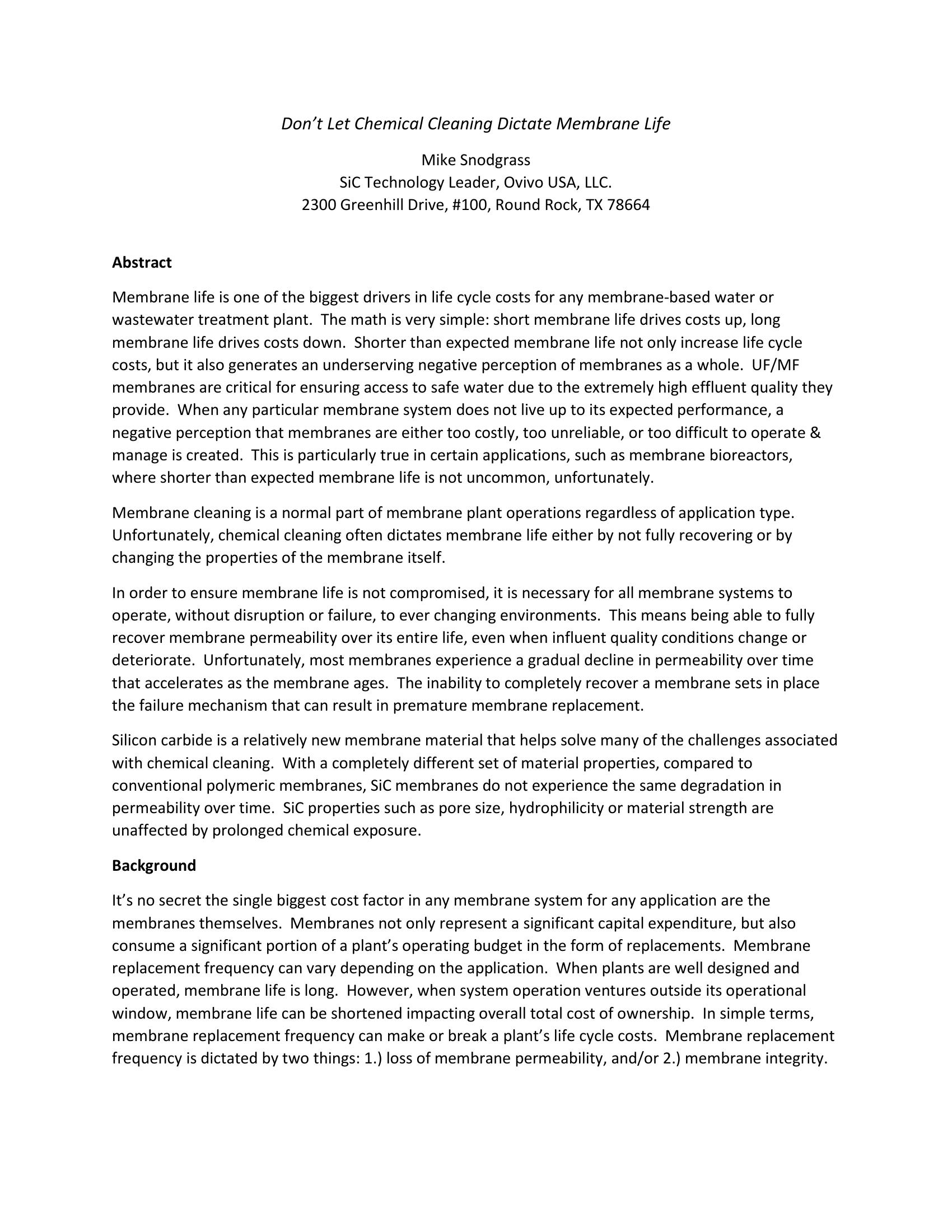 Membrane life is one of the biggest drivers in life cycle costs for any membrane-based water or wastewater treatment plant. The math is very simple: short membrane life drives costs up, long membrane life drives costs down. Shorter than expected membrane life not only increase life cycle costs, but it also generates an underserving negative perception of membranes as a whole. UF/MF membranes are critical for ensuring access to safe water due to the extremely high effluent quality they provide. When any particular membrane system does not live up to its expected performance, a negative perception that membranes are either too costly, too unreliable, or too difficult to operate & manage is created. This is particularly true in certain applications, such as membrane bioreactors, where shorter than expected membrane life is not uncommon, unfortunately. Membrane cleaning is a normal part of membrane plant operations regardless of application type. Unfortunately, chemical cleaning often dictates membrane life either by not fully recovering or by changing the properties of the membrane itself. In order to ensure membrane life is not compromised, it is necessary for all membrane systems to operate, without disruption or failure, to ever changing environments. This means being able to fully recover membrane permeability over its entire life, even when influent quality conditions change or deteriorate. Unfortunately, most membranes experience a gradual decline in permeability over time that accelerates as the membrane ages. The inability to completely recover a membrane sets in place the failure mechanism that can result in premature membrane replacement. Silicon carbide is a relatively new membrane material that helps solve many of the challenges associated with chemical cleaning. With a completely different set of material properties, compared to conventional polymeric membranes, SiC membranes do not experience the same degradation in permeability over time. SiC properties such as pore size, hydrophilicity or material strength are unaffected by prolonged chemical exposure.