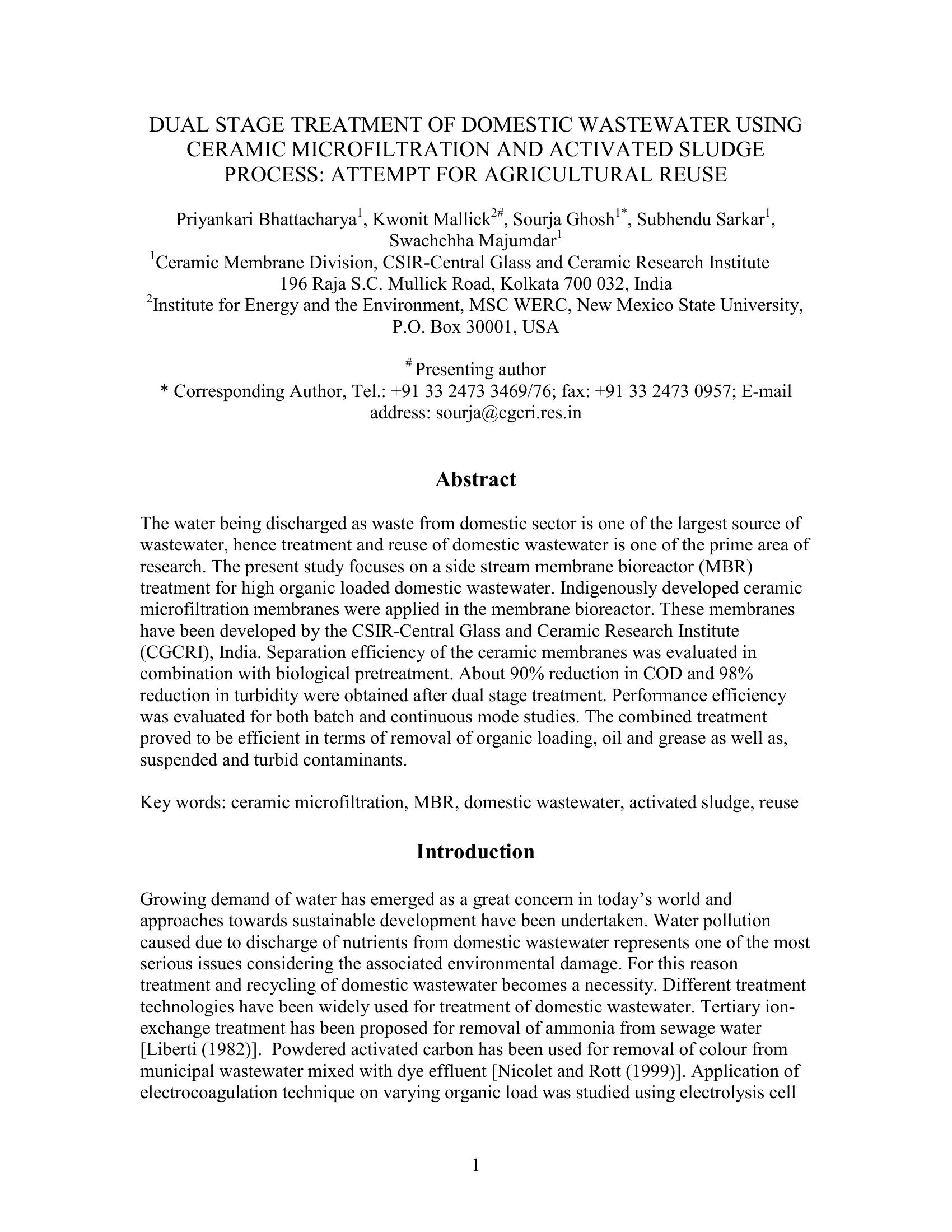 Dual Stage Treatment of Domestic Wastewater Using Ceramic Microfiltration and Activated Sludge Process: Attempt for Agricultural Reuse