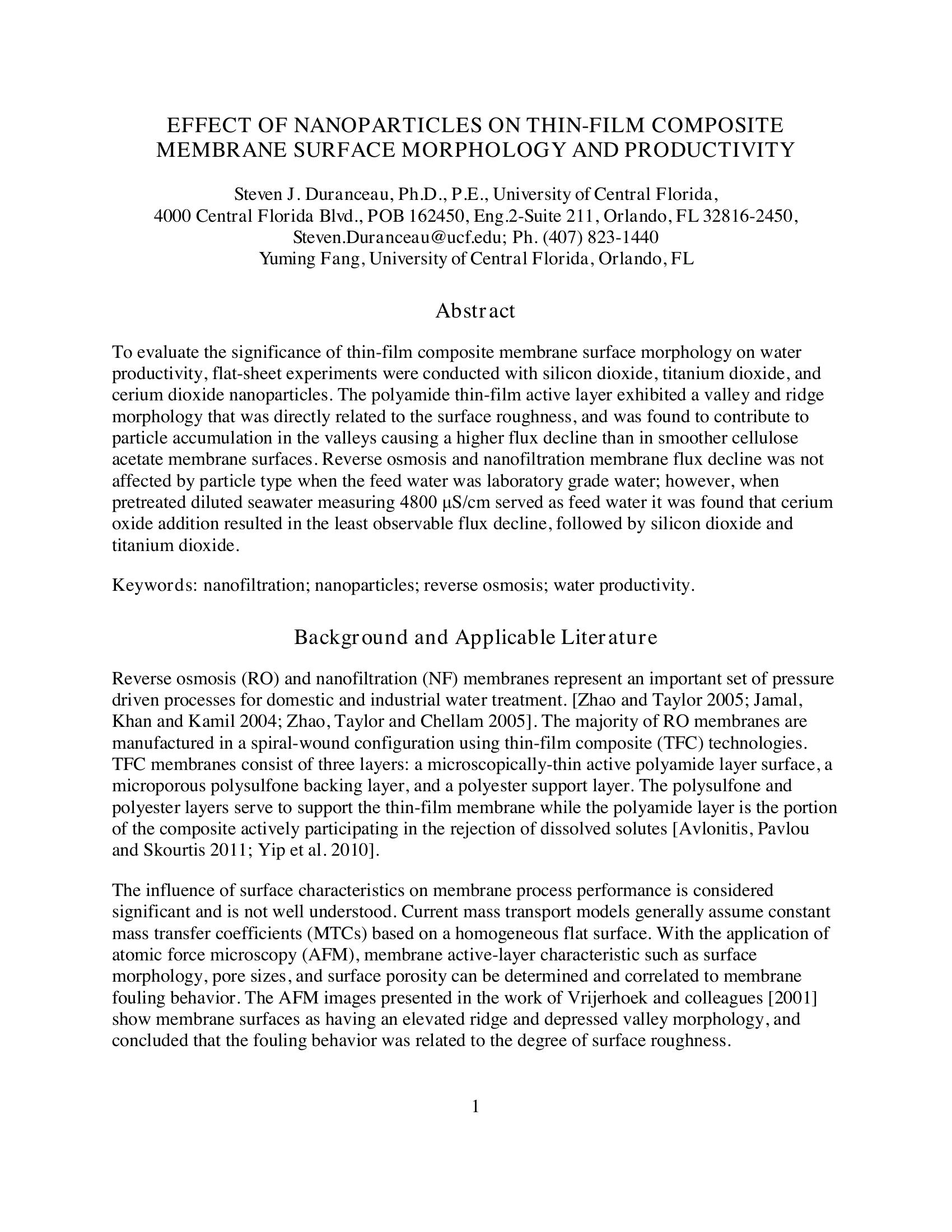 This paper describes research to evaluate the significance of thin-film composite membrane surface morphology on water productivity. Flat-sheet experiments were conducted with silicon dioxide, titanium dioxide, and cerium dioxide nanoparticles. The polyamide thin-film active layer exhibited a morphology that was directly related to the surface roughness, and was found to contribute to particle accumulation causing a higher flux decline than in other membrane surfaces. Reverse osmosis and nanofiltration membrane flux decline was not affected by particle type when the feed water was laboratory grade water; however, when pretreated diluted seawater served as feed water it was found that cerium oxide addition resulted in the least observable flux decline, followed by silicon dioxide and titanium dioxide.