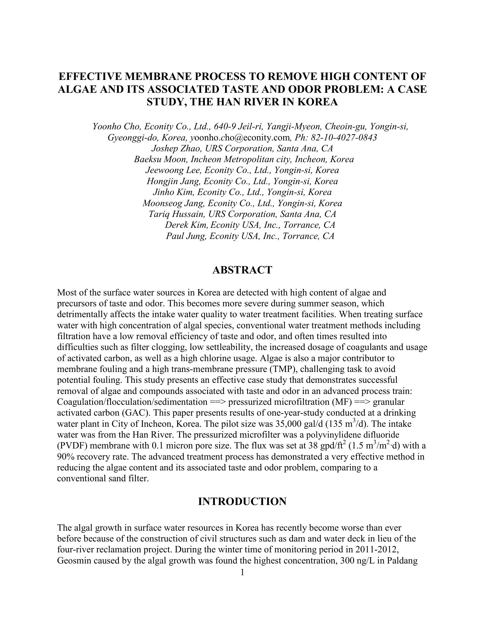 | Keywords | microfiltration, Han river, algae removal |