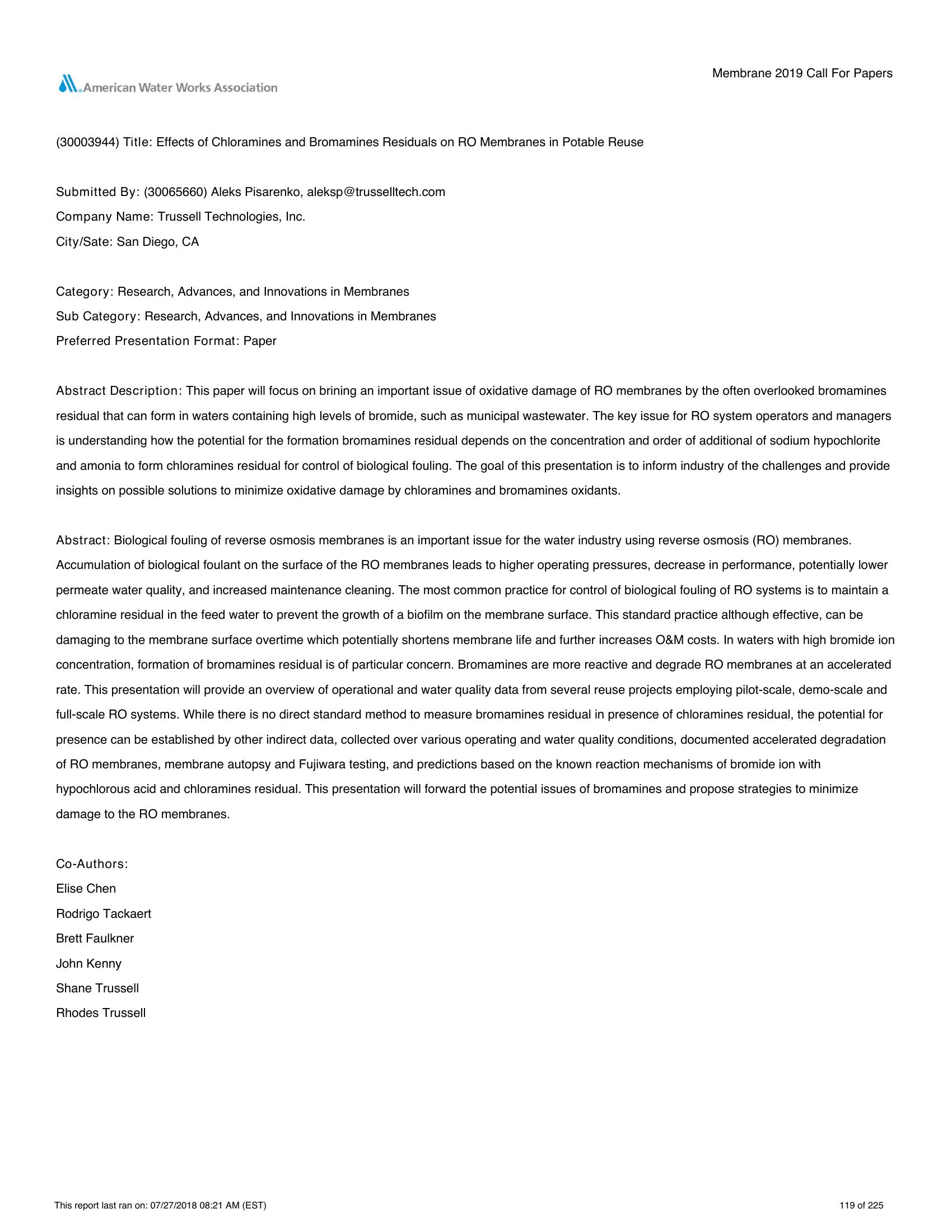 This paper will focus on brining an important issue of oxidative damage of RO membranes by the often overlooked bromamines residual that can form in waters containing high levels of bromide, such as municipal wastewater. The key issue for RO system operators and managers is understanding how the potential for the formation bromamines residual depends on the concentration and order of additional of sodium hypochlorite and amonia to form chloramines residual for control of biological fouling. The goal of this presentation is to inform industry of the challenges and provide insights on possible solutions to minimize oxidative damage by chloramines and bromamines oxidants.