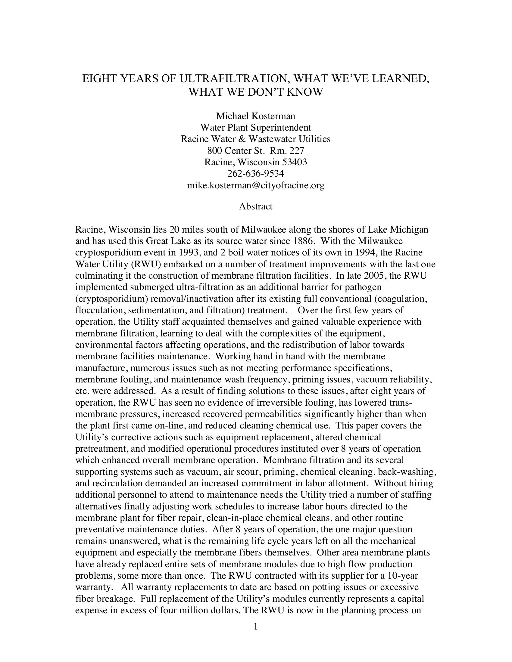 Racine Water Utility (RWU) implemented ultrafiltration treatment for pathogen removal as the final step in the drinking water treatment following conventional coagulation, flocculation, settlement, and filtration on water from Lake Michigan. Over a period of eight years RWU refined the equipment, operation and maintenance of the ultrafiltration process. There remains the issue of how long will the ultrafiltration membranes last in applications such as this one.
