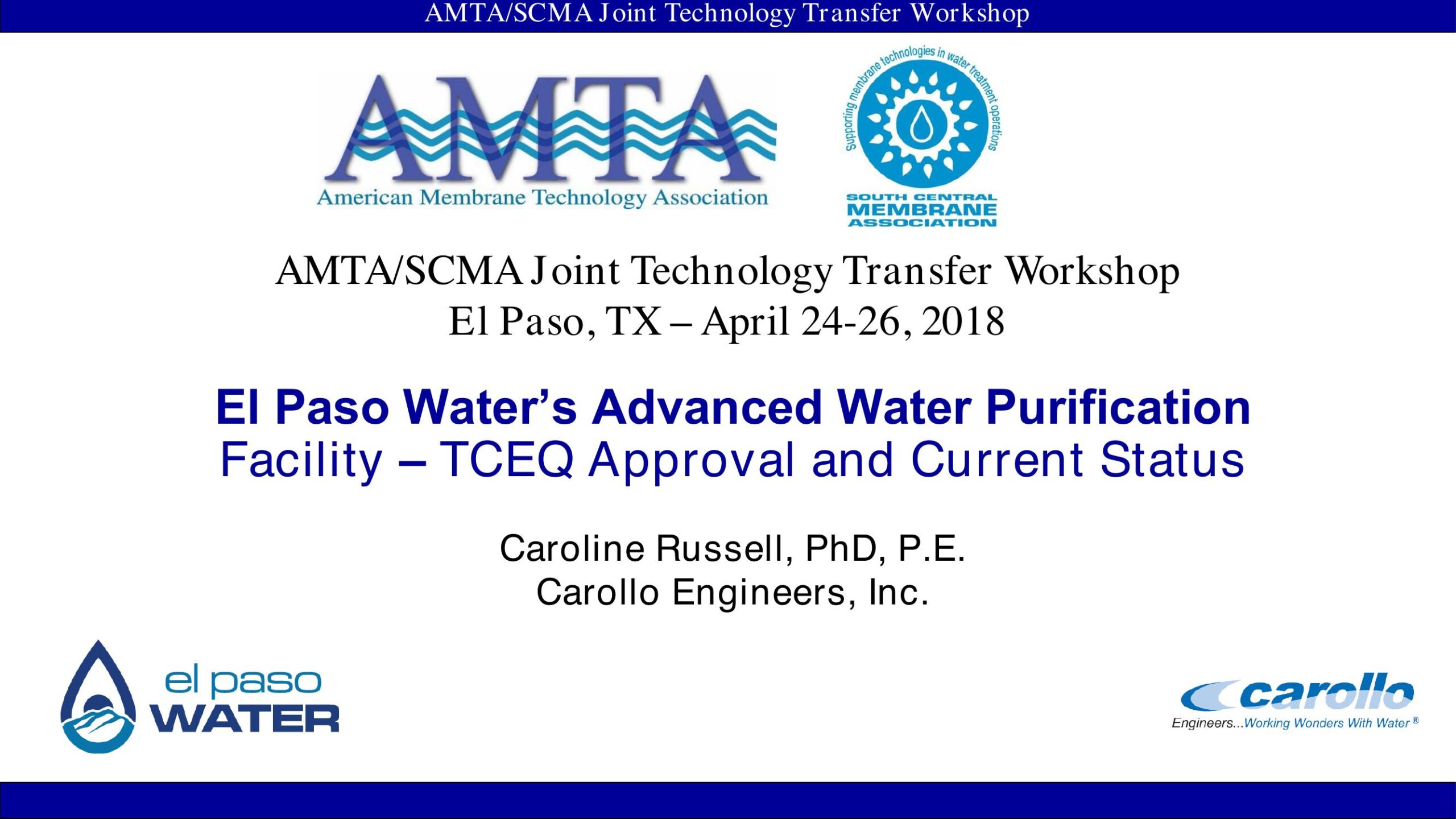 El Paso Water (EPWater) is developing the preliminary design for a new Advanced Water Purification Facility (AWPF) that would treat up to 10 million gallons per day (mgd) of secondary clarifier effluent to augment and diversify the city’s current drinking water supplies. The proposed treatment train includes membrane filtration (i.e., microfiltration (MF) / ultrafiltration (UF)), membrane desalination (i.e., nanofiltration (NF) / reverse osmosis (RO)), ultraviolet disinfection with advanced oxidation, granular activated carbon (GAC) for peroxide quenching, stabilization, and disinfection with free chlorine. This presentation will provide information on the regulatory requirements for approval of the AWPF, focusing on pilot testing and approval of the membrane filtration and membrane desalination processes.