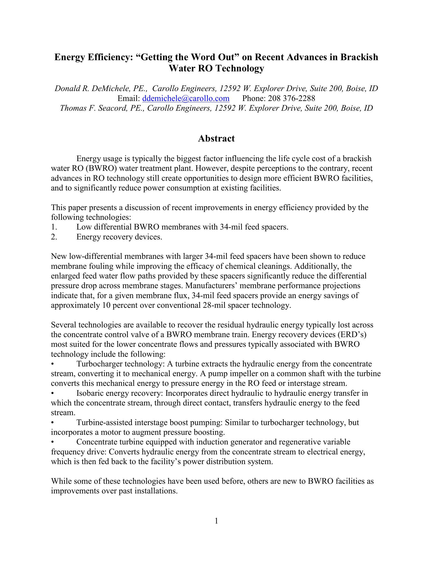 Energy Efficiency: ?Getting the Word Out? on Recent Advances in Brackish Water RO Technology