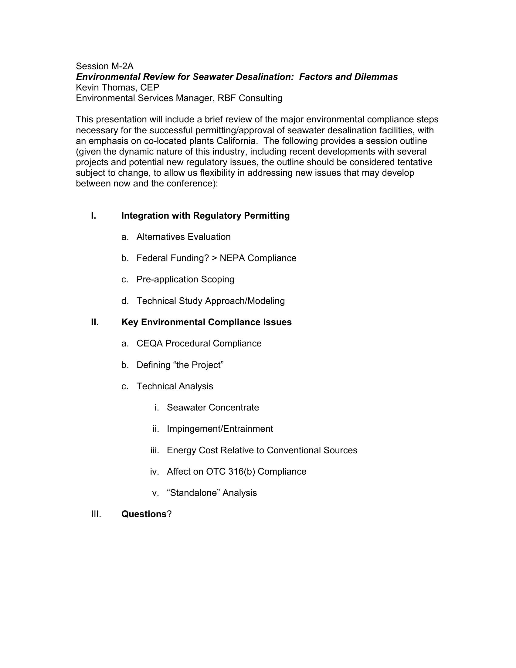 This presentation summarizes the major environmental compliance steps necessary for the successful permitting/approval of seawater desalination facilities, with