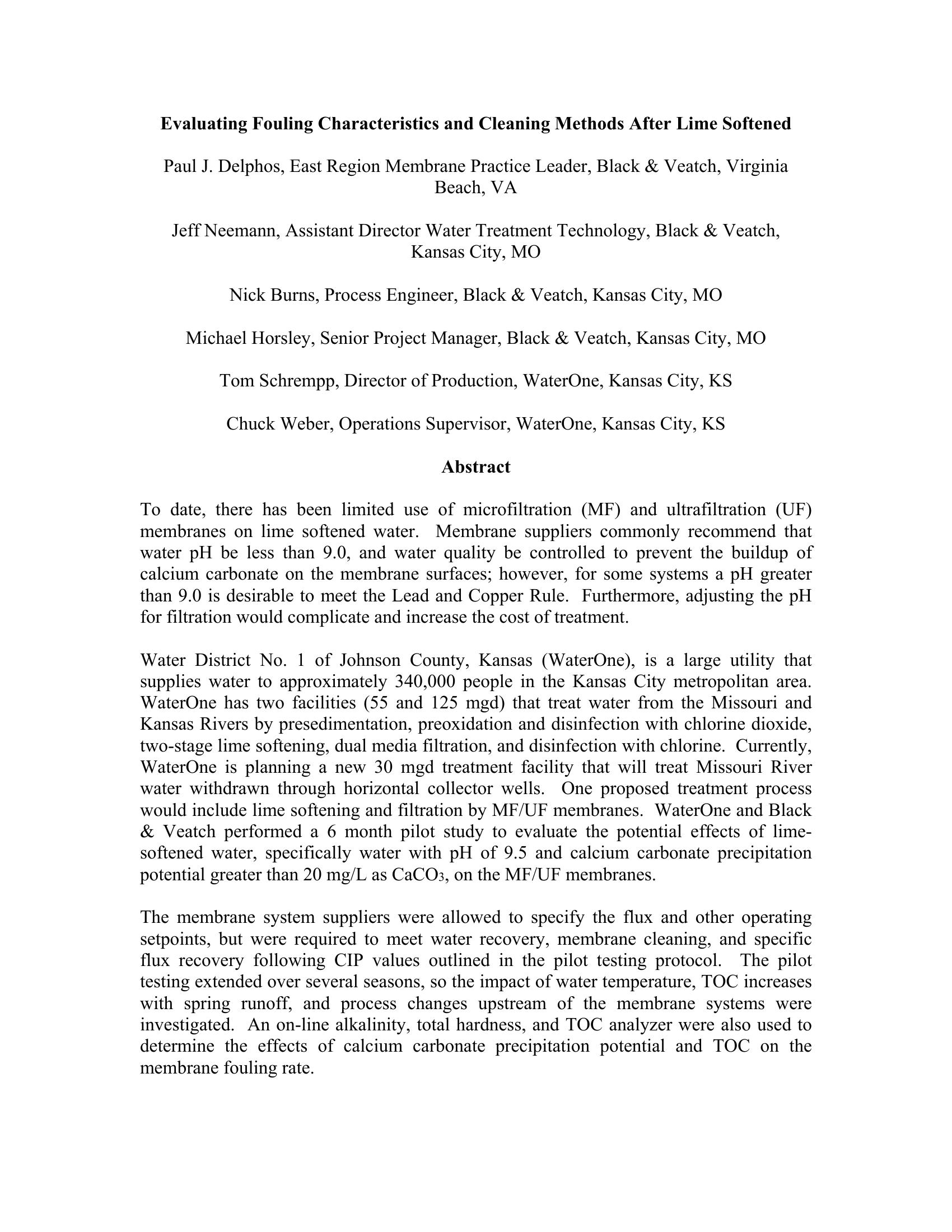 Water District No. 1 of Johnson County, Kansas (WaterOne) is a large utility that supplies water to approximately 340,000 people in the Kansas City metropolitan area. Currently, WaterOne is planning a new 30 mgd treatment facility that will treat Missouri River water withdrawn through horizontal collector wells. One proposed treatment process would include lime softening and filtration by MF/UF membranes. WaterOne and Black & Veatch performed a 6 month pilot study to evaluate the potential effects of limesoftened water, specifically water with pH of 9.5 and calcium carbonate precipitation potential greater than 20 mg/L as CaCO3, on the MF/UF membranes. The pilot testing extended over several seasons, so the impact of water temperature, TOC increases with spring runoff, and process changes upstream of the membrane systems were investigated.