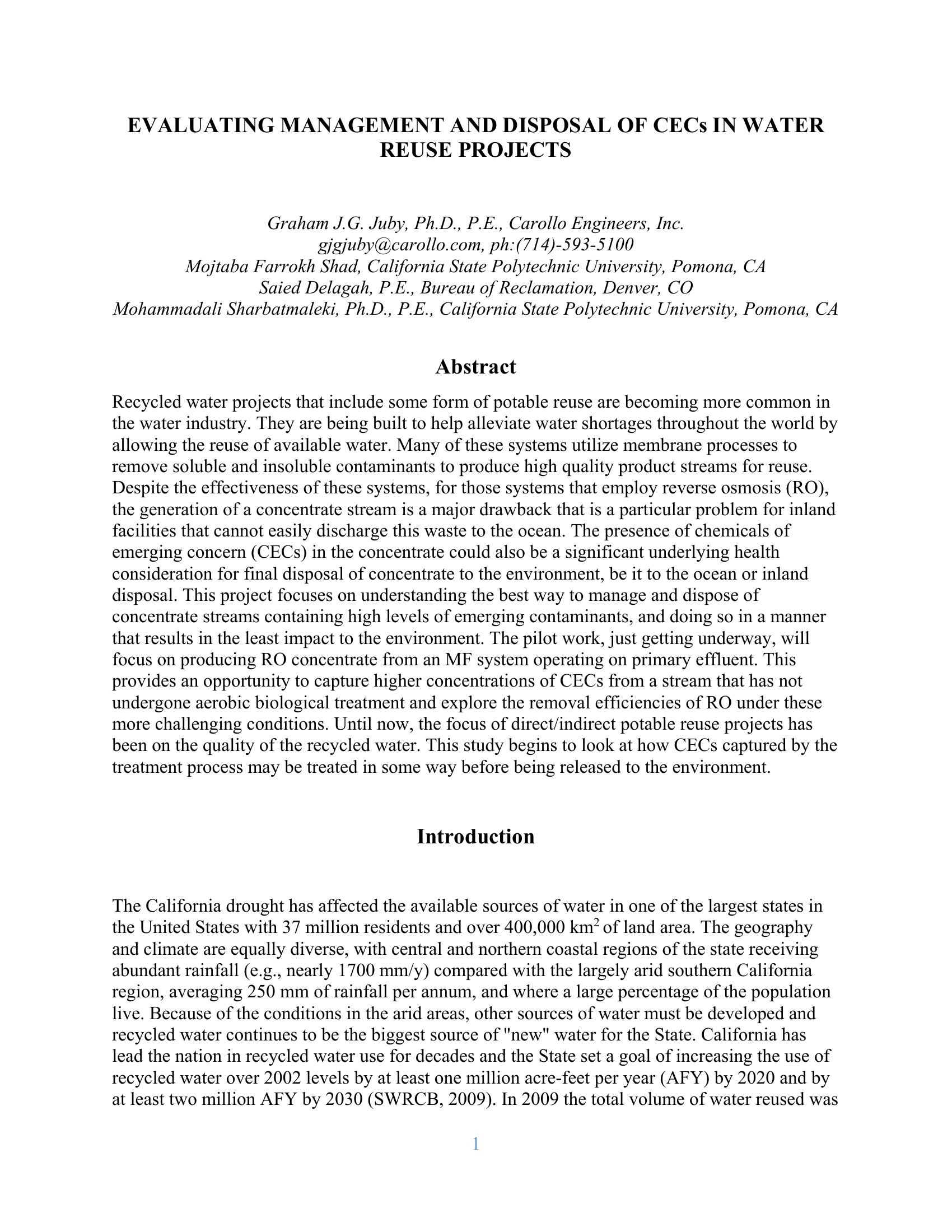 Recycled water projects that include some form of potable reuse are becoming more common in the water industry. They are being built to help alleviate water shortages throughout the world by allowing the reuse of available water. Many of these systems utilize membrane processes to remove soluble and insoluble contaminants to produce high quality product streams for reuse. Despite the effectiveness of these systems, for those systems that employ reverse osmosis (RO), the generation of a concentrate stream is a major drawback that is a particular problem for inland facilities that cannot easily discharge this waste to the ocean. The presence of chemicals of emerging concern (CECs) in the concentrate could also be a significant underlying health consideration for final disposal of concentrate to the environment, be it to the ocean or inland disposal. This project focuses on understanding the best way to manage and dispose of concentrate streams containing high levels of emerging contaminants, and doing so in a manner that results in the least impact to the environment. The pilot work, just getting underway, will focus on producing RO concentrate from an MF system operating on primary effluent. This provides an opportunity to capture higher concentrations of CECs from a stream that has not undergone aerobic biological treatment and explore the removal efficiencies of RO under these more challenging conditions. Until now, the focus of direct/indirect potable reuse projects has been on the quality of the recycled water. This study begins to look at how CECs captured by the treatment process may be treated in some way before being released to the environment.
