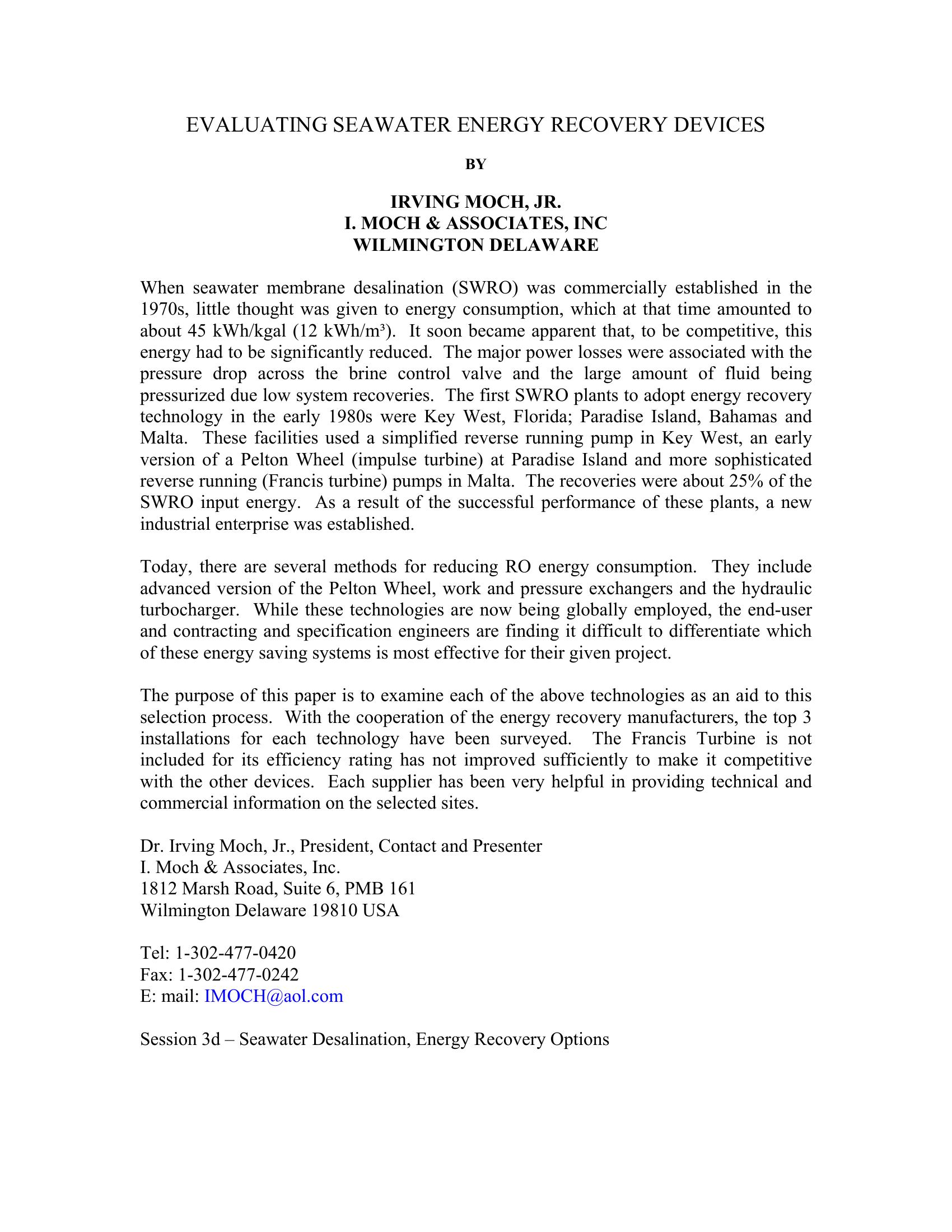 There are several methods for reducing RO energy consumption in seawater membrane desalination (SWRO). They include advanced version of the Pelton Wheel, work and pressure exchangers and the hydraulic turbocharger. While these technologies are now being globally employed, the end-user and contracting and specification engineers are finding it difficult to differentiate which of these energy saving systems is most effective for their given project. The purpose of this paper is to examine each of the technologies as an aid to this selection process. With the cooperation of the energy recovery manufacturers, the top 3 installations for each technology were surveyed. There are five major commercial energy recovery devices (ERD): hydraulic turbocharger, pressure exchanger, work exchanger, Pelton wheel sometimes called impulse turbine and Francis turbine also called reverse running pump. This study includes a description of each system along with a picture or schematic of the unit as sold by its major proponent and the equations that can be employed to calculate the energy consumed. ERDs are associated in a fashion to the high pressure pump (HPP) and this couplet is the main contributor (about 80%) of the total energy utilized in a SWRO facility. Variable frequency drives (VFD) are currently being employed on most high energy consuming pumps.