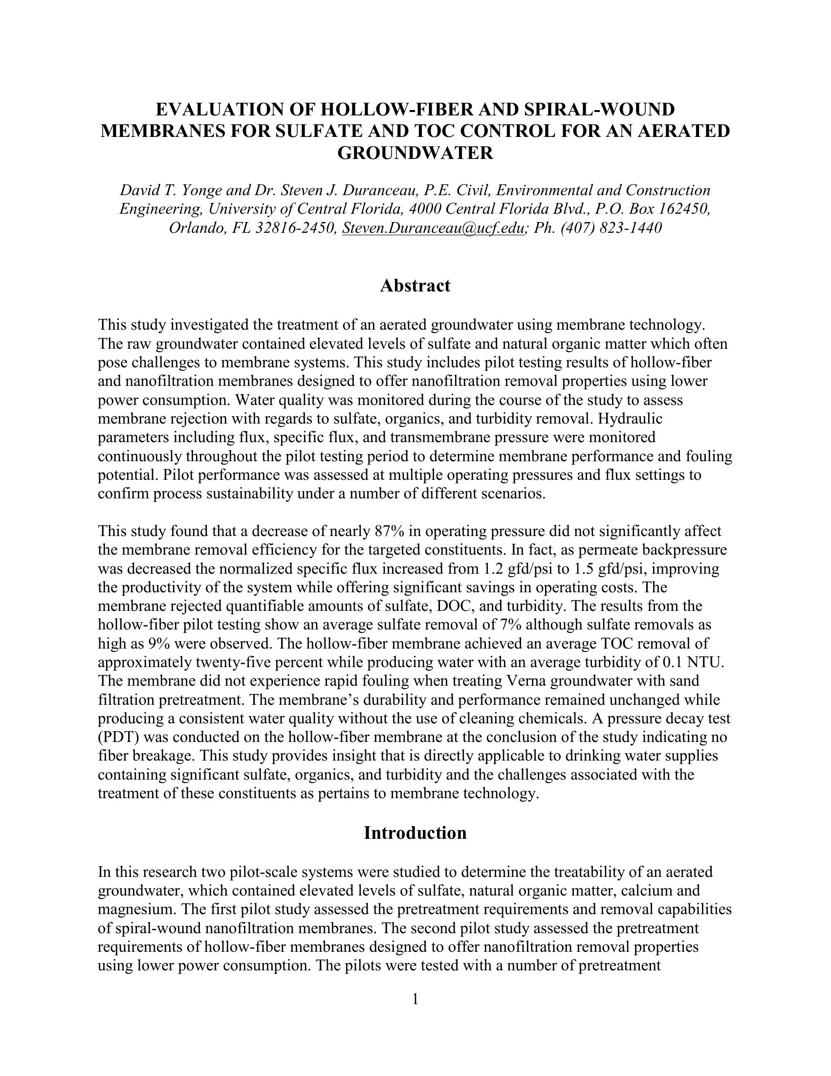| Keywords | Sultate and TOC Control, Aerated Groundwater, Hollow Fiber UF, City of Sarasota |