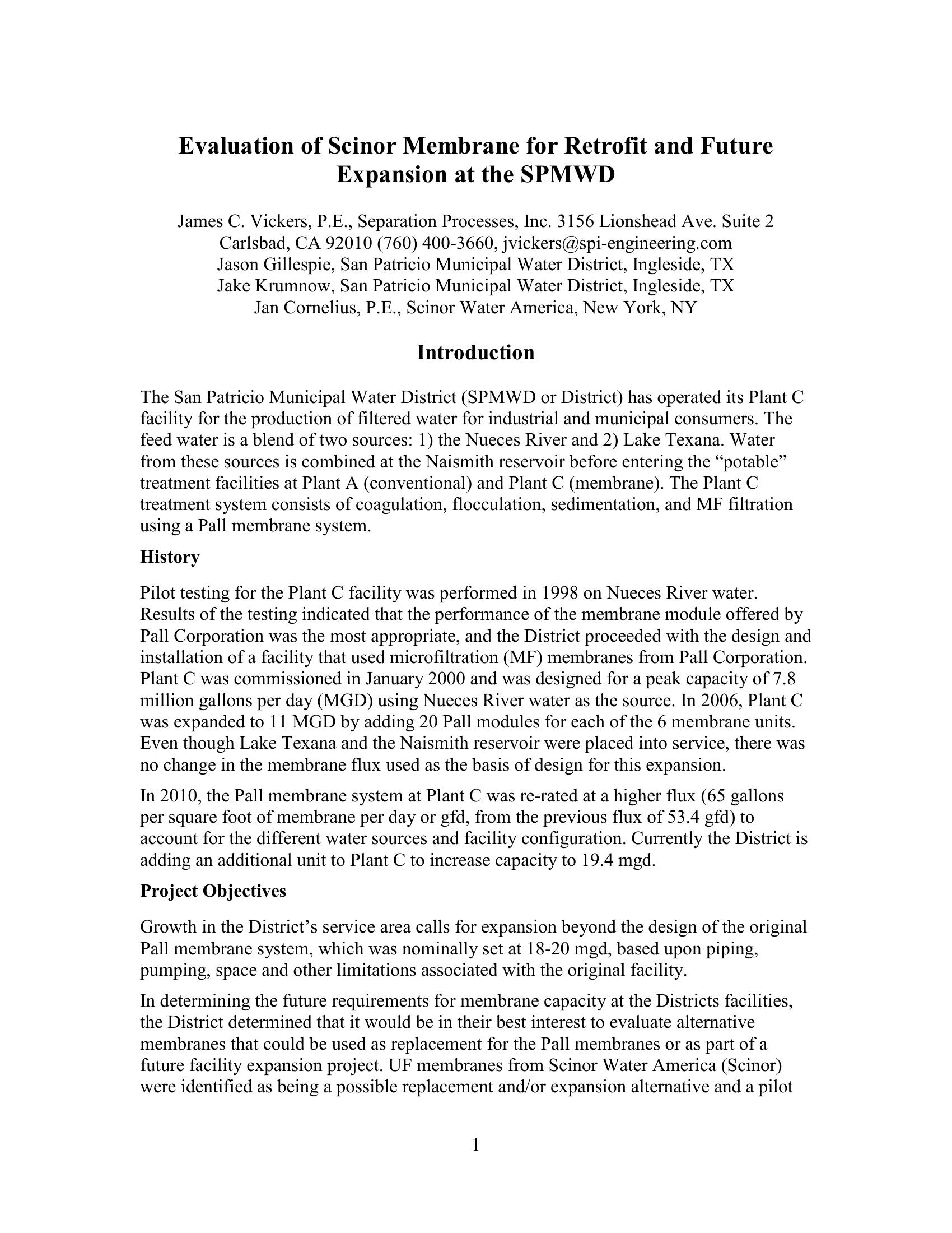 This paper describes pilot testing at the San Patricio Municipal Water District (SPMWD) to quality a Scinor membrane module for use for a retrofit and expansion at the plant. The plant wanted to evaluate alternative membranes that could be used as replacement for the currently installed membranes. Pilot procedures and data along with analyses are presented.