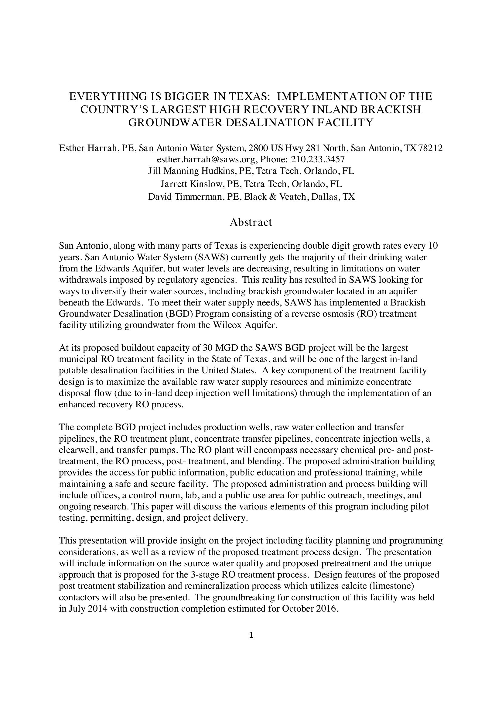 This presentation provides insight on the San Antonio Water System (SAWS) project including facility planning and programming considerations, as well as a review of the proposed treatment process design. It includes information on the source water quality and proposed pretreatment and the unique approach proposed for the 3-stage RO treatment process. Design features of the proposed post treatment stabilization and remineralization process which uses calcite (limestone) contactors is also presented.
