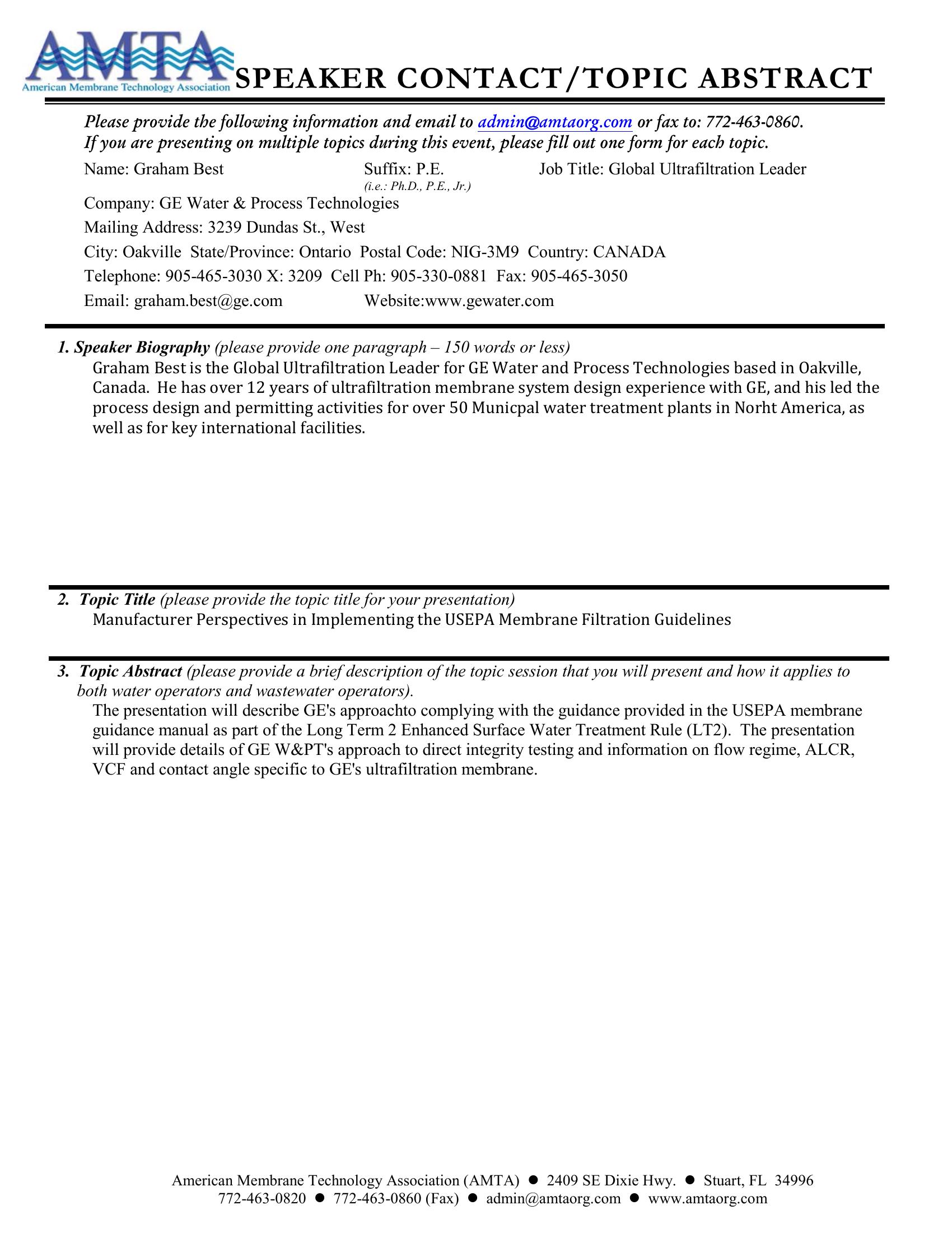 The presentation describes GE’s approach to complying with the guidance provided in the USEPA membrane guidance manual as part of the Long Term 2 Enhanced Surface Water Treatment Rule (LT2). The presentation provides details of GE W&PT’s approach to direct integrity testing and information on flow regime, ALCR, VCF and contact angle specific to GE’s ultrafiltration membrane.