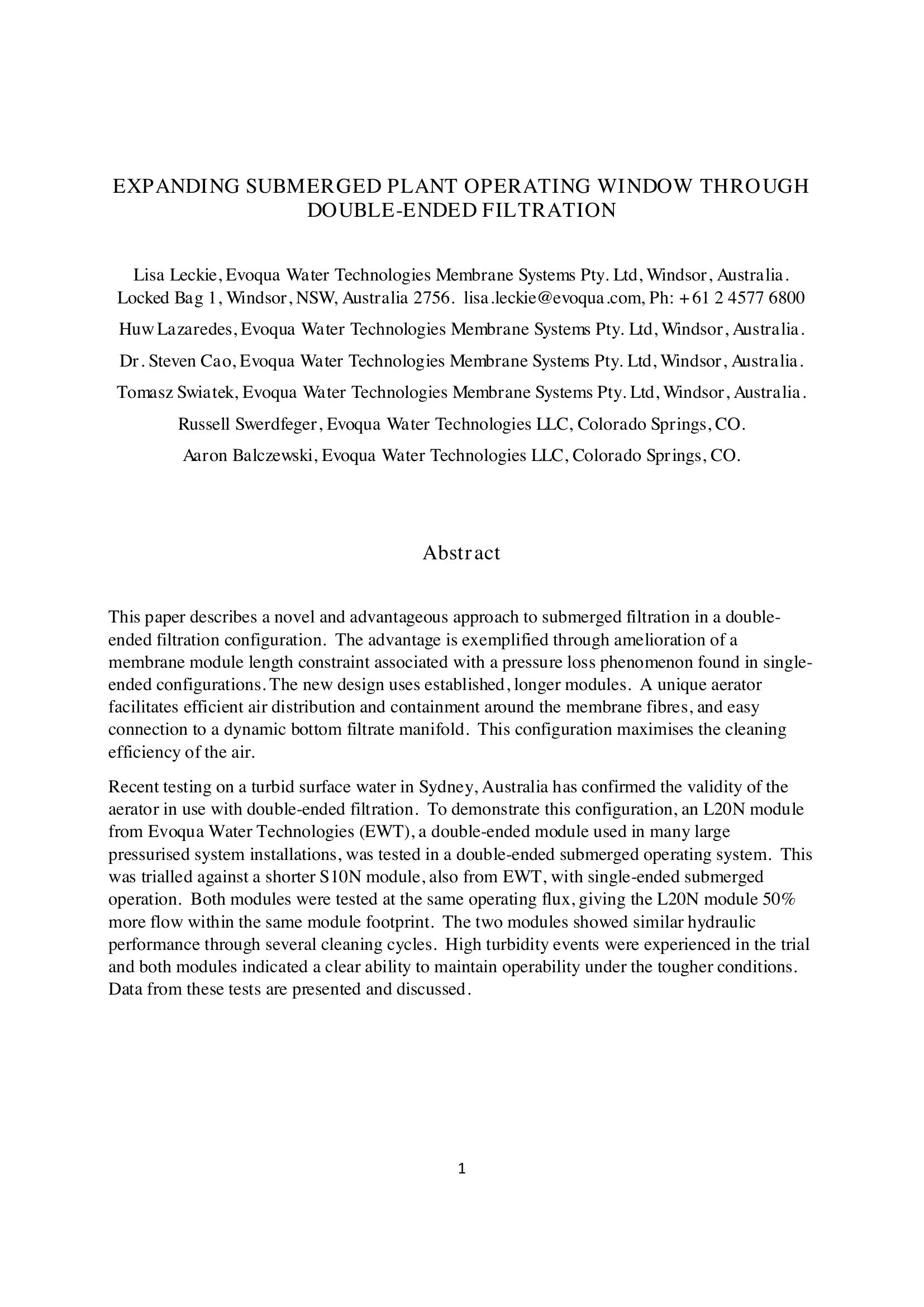 This paper describes the application of a double ended submerged filtration system in Sydney Australia. Several different modules were tested and high turbidity experienced during the test period were handled effectivity and showed that the method was sound. Test results are presented.