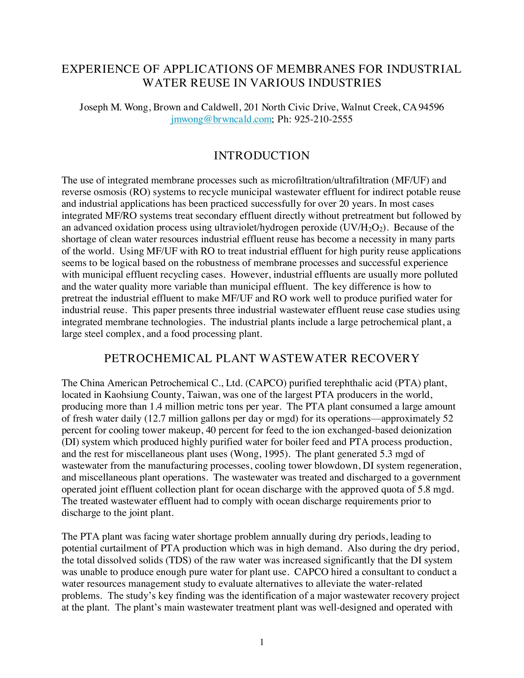 Experience of Applications of Membranes for Industrial Water Reuse in Various Industries