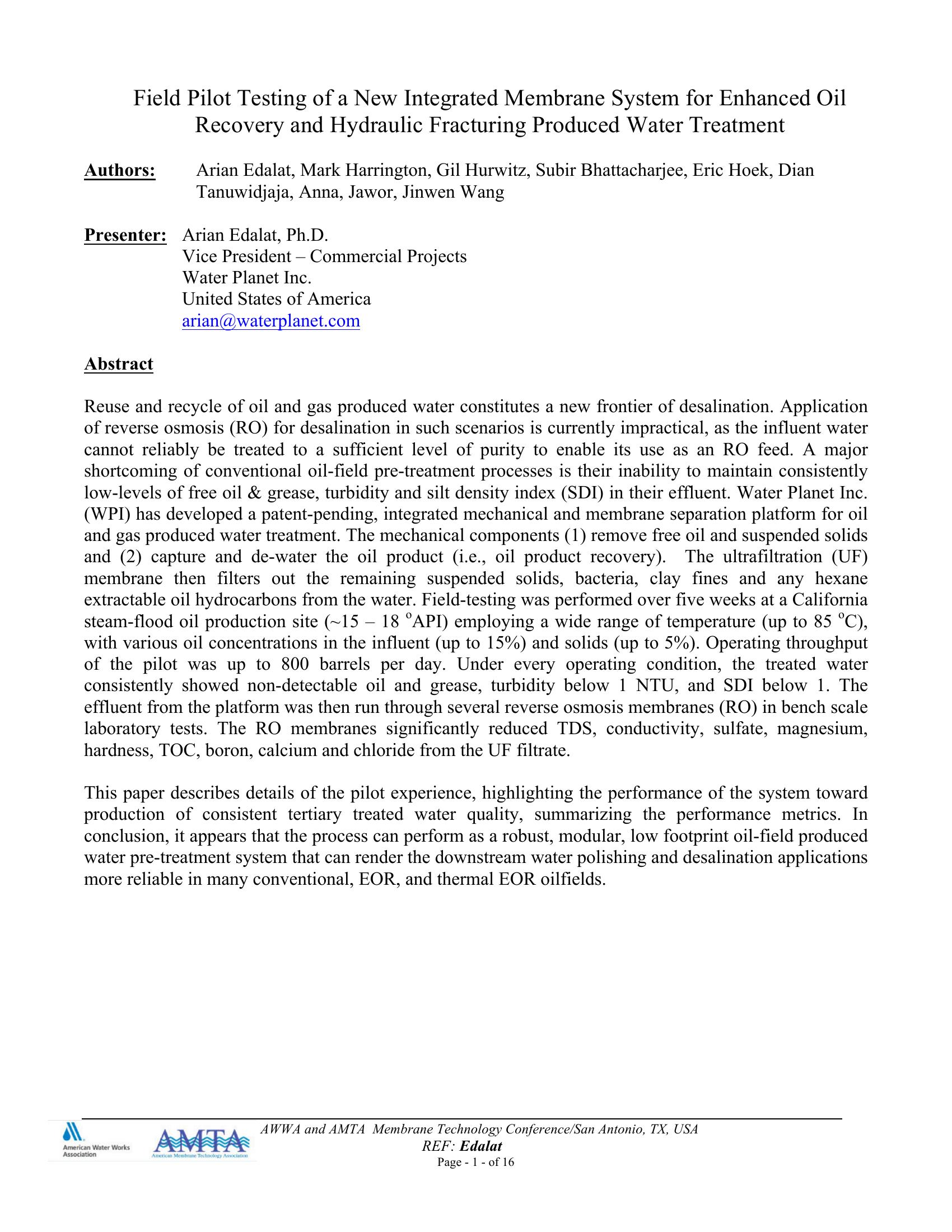 Field Pilot Testing of a New Integrated Membrane System for EOR and Hydraulic Fracturing Produced Water Treatment
