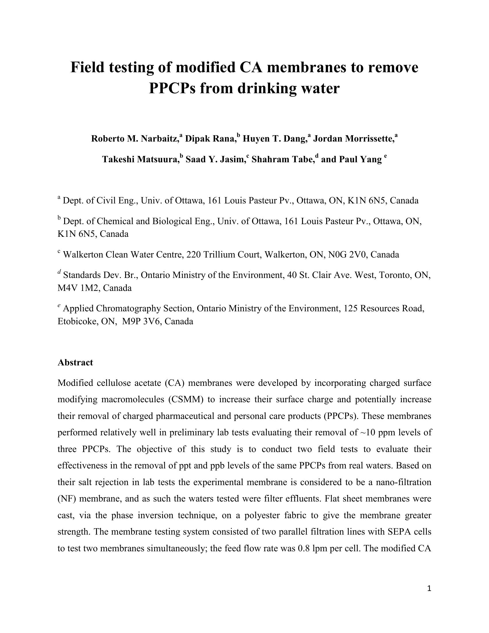 Field testing of modified CA membranes to remove PPCPs from drinking water