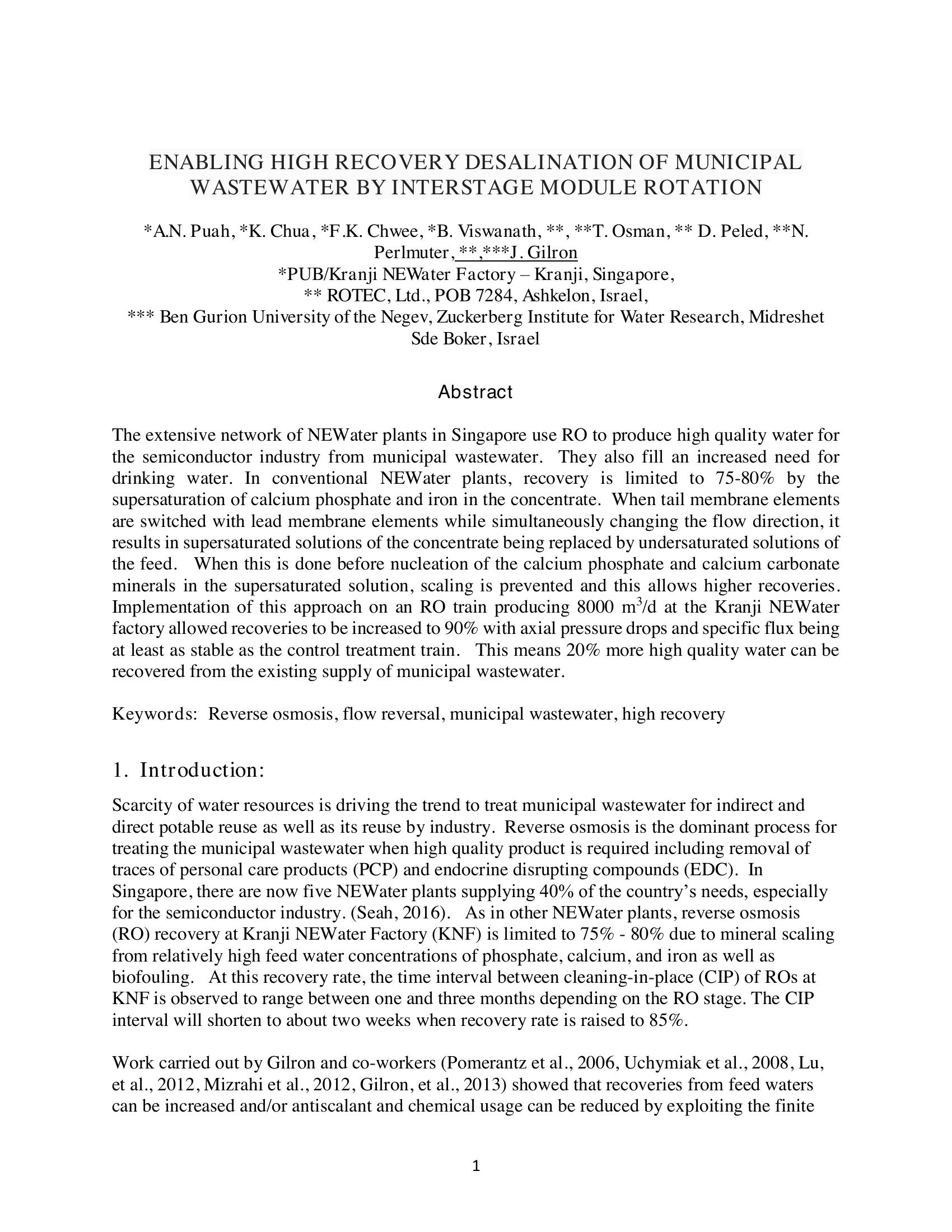 The extensive network of NEWater plants in Singapore use RO to produce high quality water for the semiconductor industry from municipal wastewater. They also fill an increased need for drinking water. In conventional NEWater plants, recovery is limited to 75-80% by the supersaturation of calcium phosphate and iron in the concentrate. When tail membrane elements are switched with lead membrane elements while simultaneously changing the flow direction, it results in supersaturated solutions of the concentrate being replaced by undersaturated solutions of the feed. When this is done before nucleation of the calcium phosphate and calcium carbonate minerals in the supersaturated solution, scaling is prevented and this allows higher recoveries. Implementation of this approach on an RO train producing 8000 m3/d at the Kranji NEWater factory allowed recoveries to be increased to 90% with axial pressure drops and specific flux being at least as stable as the control treatment train. This means 20% more high quality water can be recovered from the existing supply of municipal wastewater.