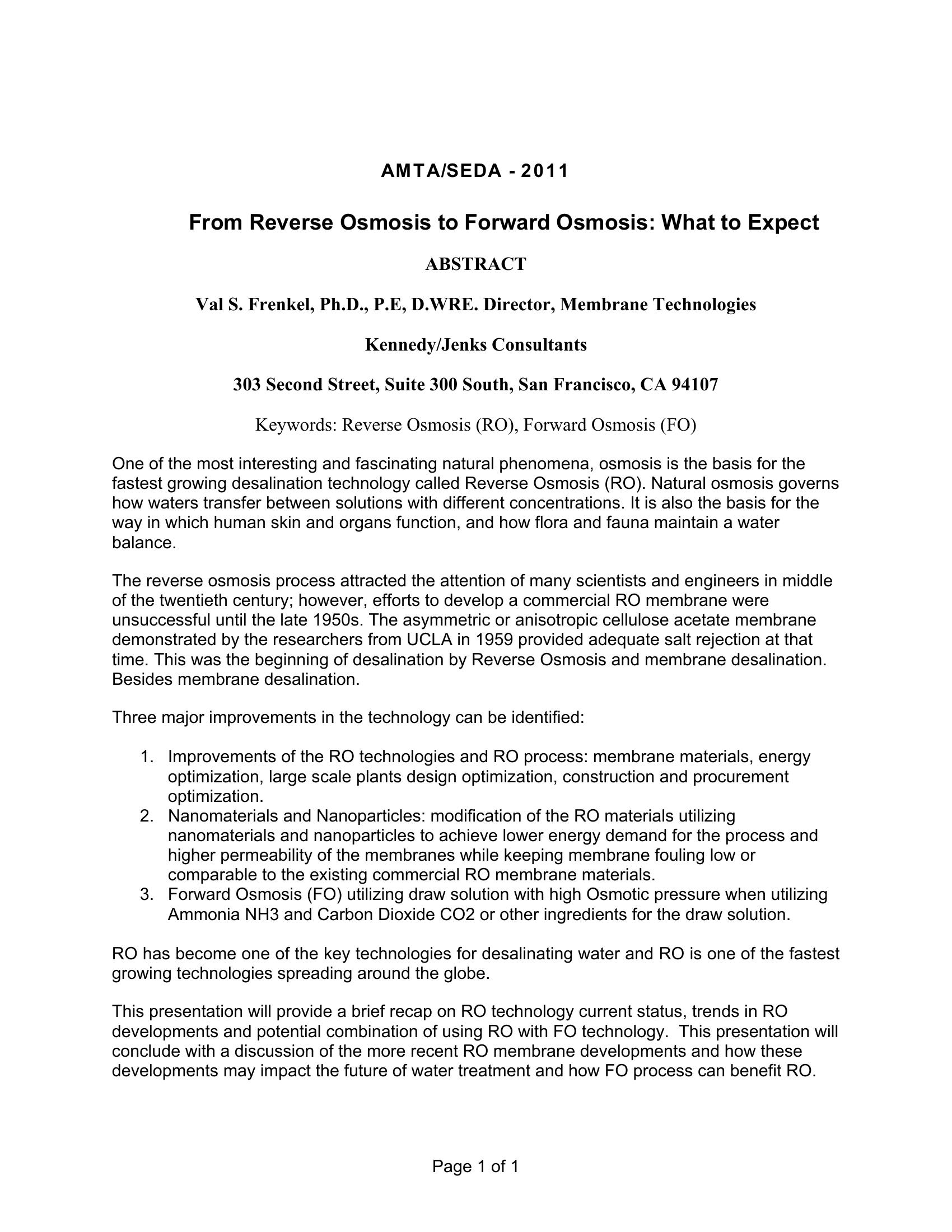 This presentation will provide a brief recap on RO technology current status, trends in RO developments and potential combination of using RO with FO technology.