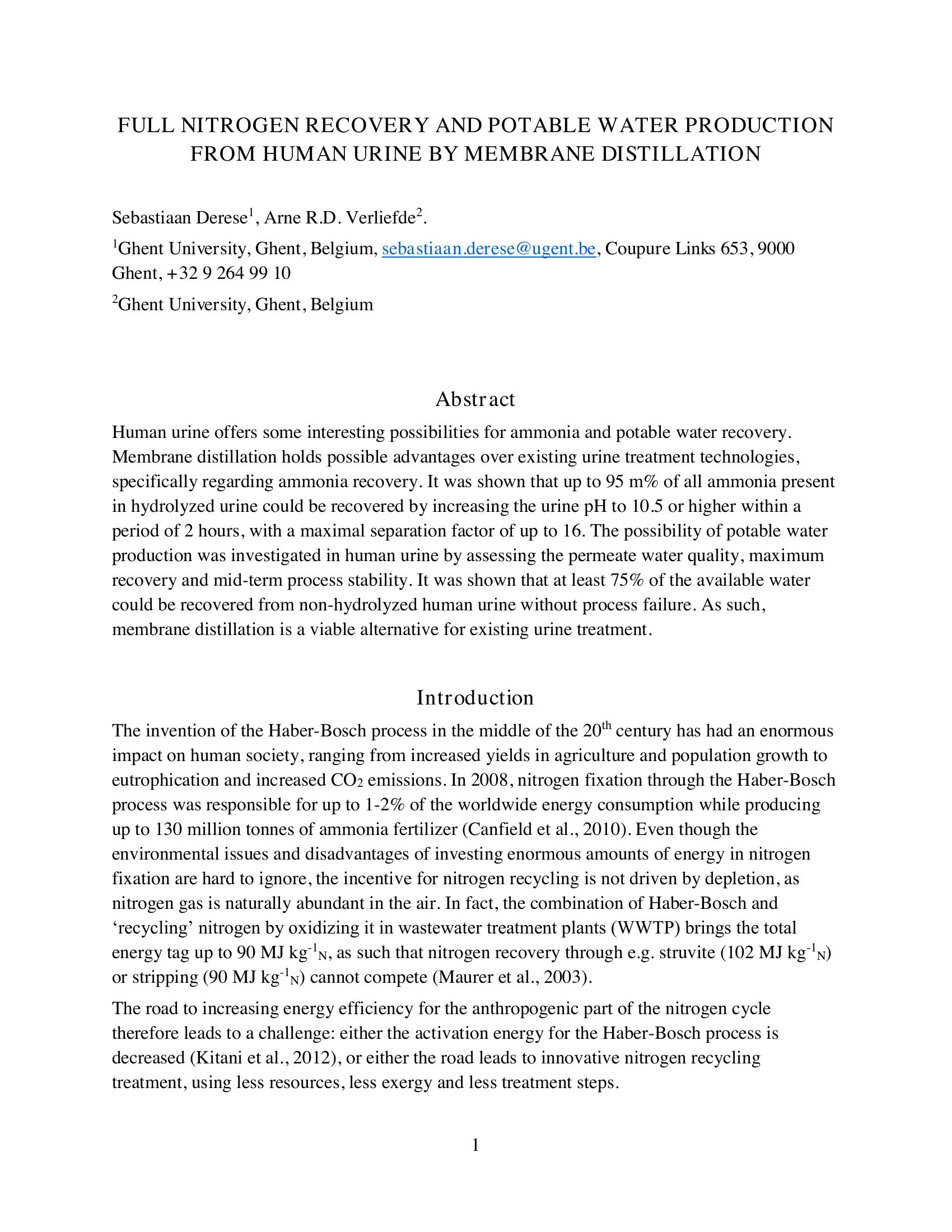Full Nitrogen Recovery And Potable Water Production From Human Urine By Membrane Distillation