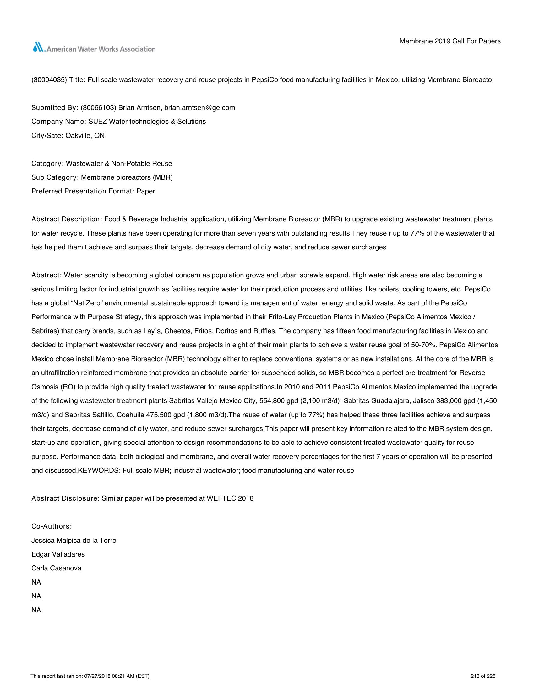Full Scale Wastewater Recovery and Reuse Projects in Three Food Manufacturing Facilities in Mexico, Utilizing MBR