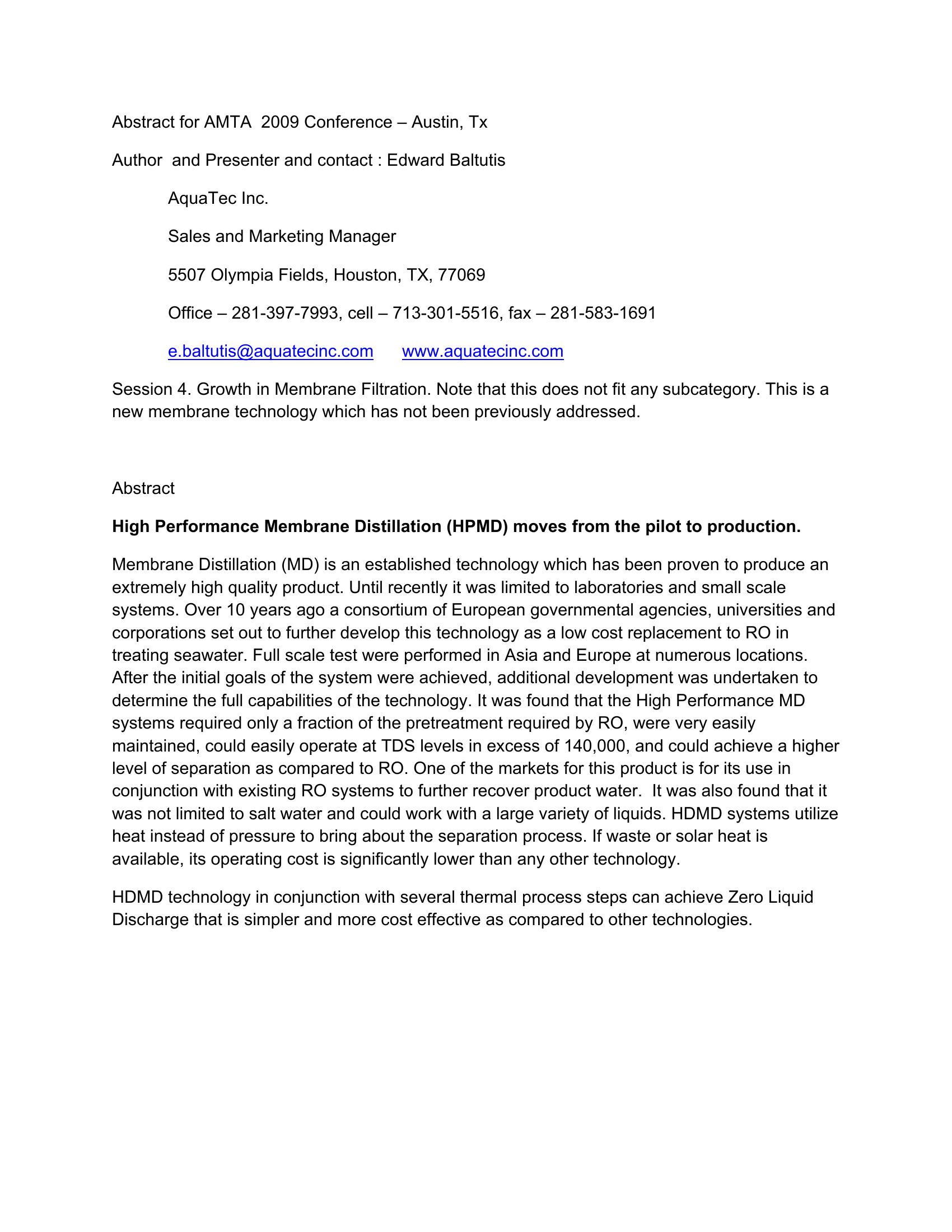 Membrane Distillation (MD) is an established technology which has been proven to produce an extremely high quality product. Until recently it was limited to laboratories and small scale systems. Over 10 years ago a consortium of European governmental agencies, universities and corporations set out to further develop this technology as a low cost replacement to RO in treating seawater. Full scale test were performed in Asia and Europe at numerous locations.