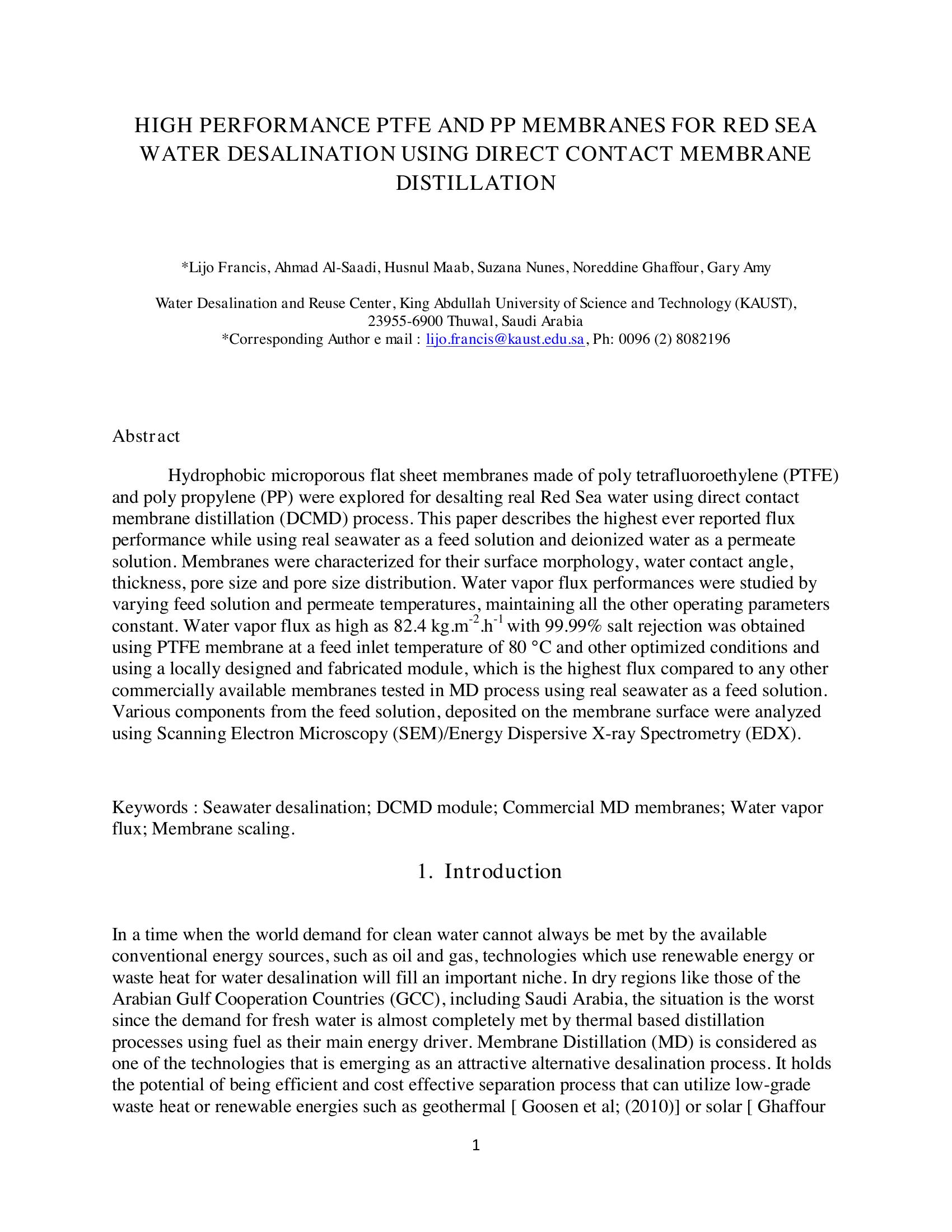 This paper discusses hydrophobic microporous flat sheet membranes made of poly tetrafluoroethylene (PTFE) and poly propylene (PP) were explored for desalting real Red Sea water using direct contact membrane distillation (DCMD) process. This paper describes reported flux performance membrane characterization, water contact angle as well as other related items. Various components from the feed solution, deposited on the membrane surface were analyzed using Scanning Electron Microscopy (SEM)/Energy Dispersive X-ray Spectrometry (EDX).